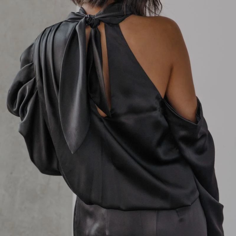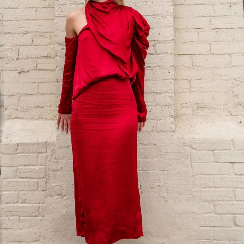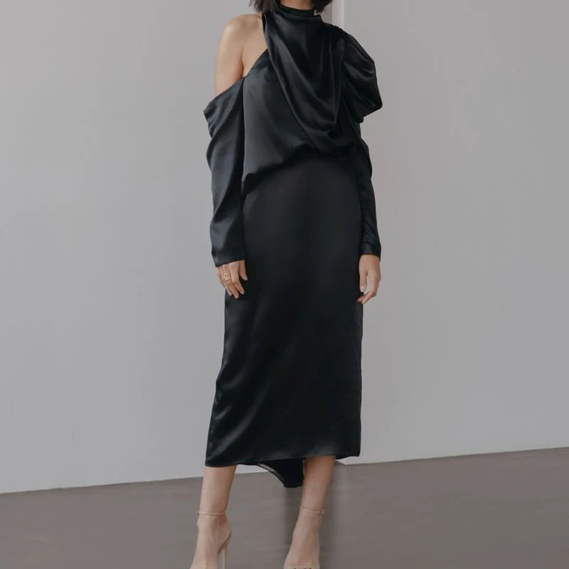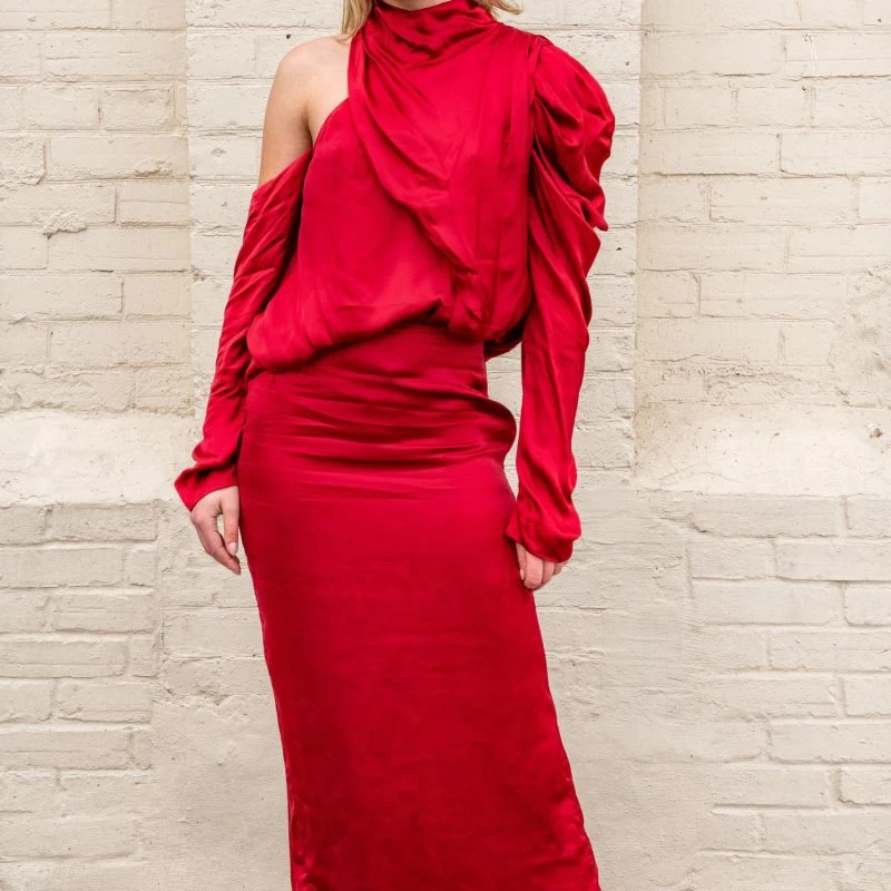 This ‘Anabele Silky’ midi dress is cut from luxe silky into a draped neckline silhouette that balances minimalism and grandeur. With the elegant puffed sleeve and the detailed cut-out sleeve this Vasiliki statement dress works for a variety of occasions. Highlight its intricate details with dropped earrings and high heel sandals.