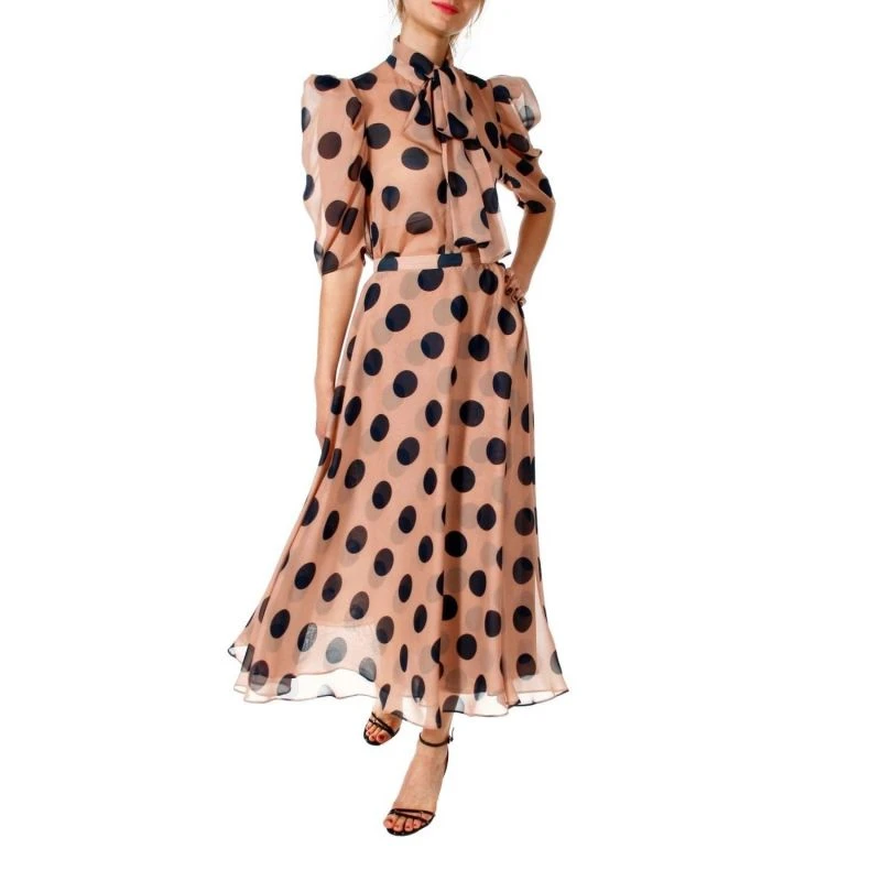 A blouse with puffy sleeves made of delicate, soft-fitting silk chiffon. The impressive, spatial form of the sleeves underlined by a small pillow is the hottest trend of the season. Finished with a stand-up collar to which a sash is sewn, which can be tied in several ways or worn nonchalantly untied. The blouse is fastened with covered buttons. This feminine and elegant cut will be perfect when combined with an elegant midi skirt and wide pants. Matches with our Rugby Tan Skirt.