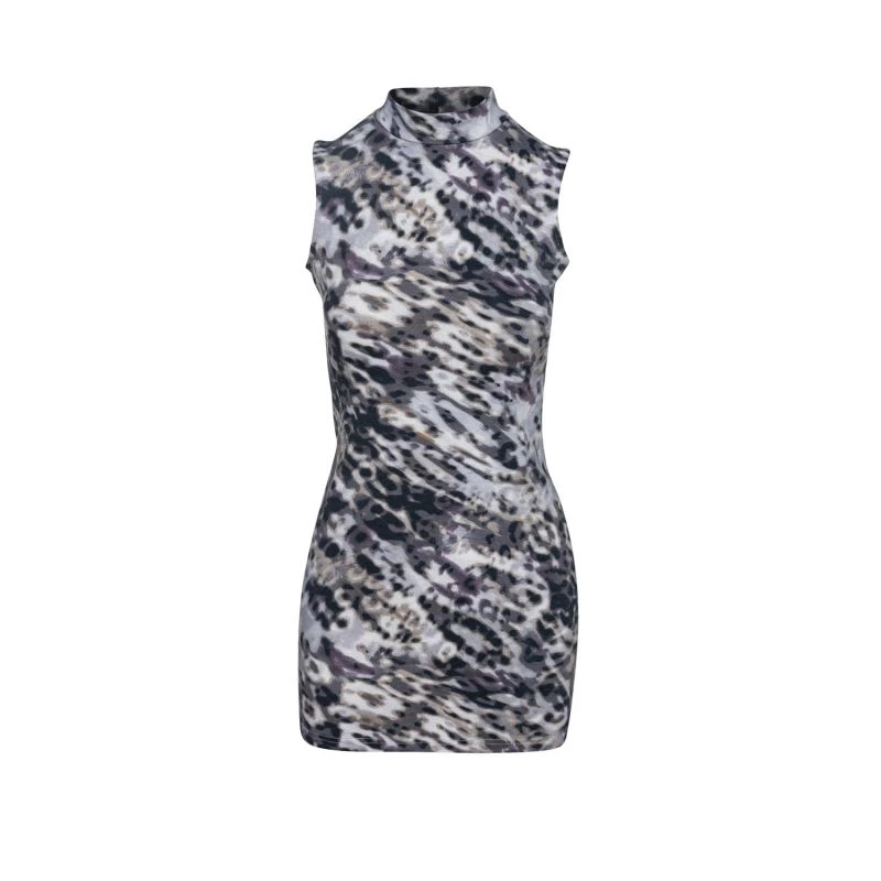 Slinky and soft, this sleek straight stretch dress will add a sexy accent to your closet this season. The fashion forward animal print adds contemporary appeal while an open back creates an irresistibly sensual vibe. An edgy clutch and a ruby red lip will complement your look. Turtle neck. Sleeveless.
