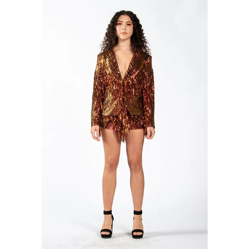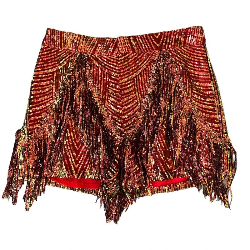 Shimmy the night away in our fringetastic, sequinned rust shorts! Our Any Old Iron Rust Shorts are everything a sparkly person could dream of. Overloaded with sequins and fringe, these shorts are sure to capture, not only the light, but the eyes of those around you! The fire-like shades that dance off the sequins provide depth to the garment and make it even more exquisite. It is the perfect show-stopper! To complete the look, pair the Rust Shorts with our Any Old Iron Rust Jacket!