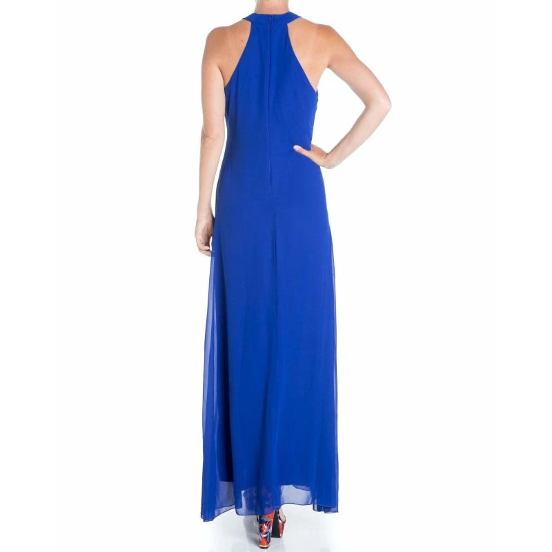 The center back has an invisible zipper closure with hook and eye clasp closure. This maxi dress is cut from sheer, lightweight chiffon in a bright royal blue hue and is fully lined.