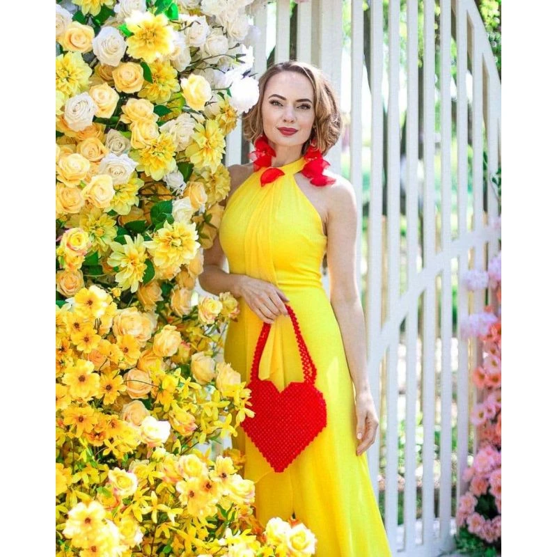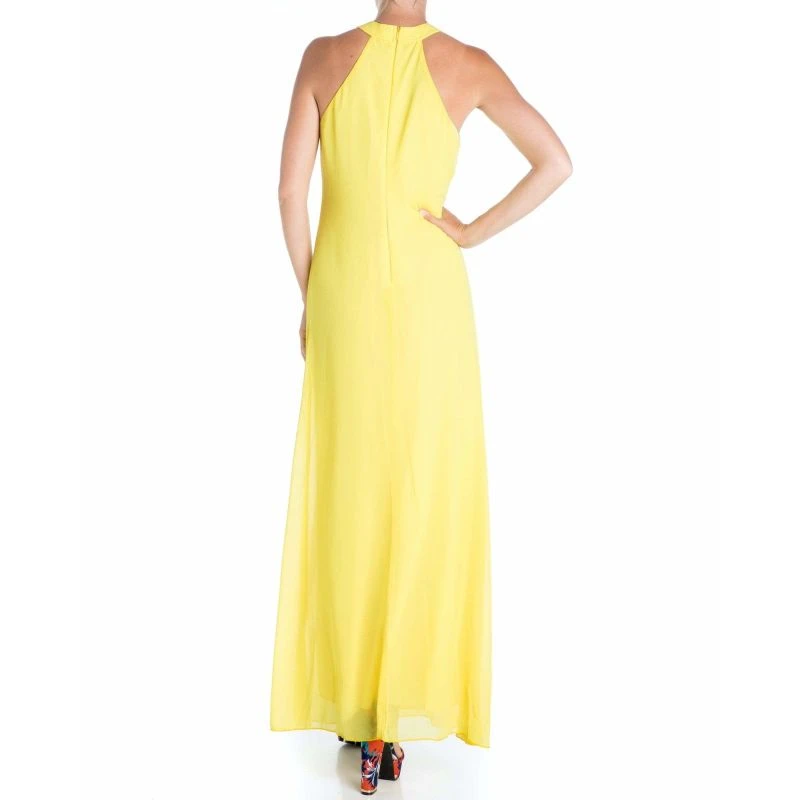 The center back has an invisible zipper closure with hook and eye clasp closure. This maxi dress is cut from opaque, pebbled chiffon in a bright yellow color fabrication, and is fully lined.