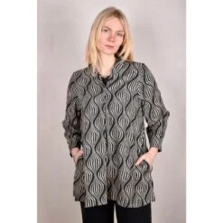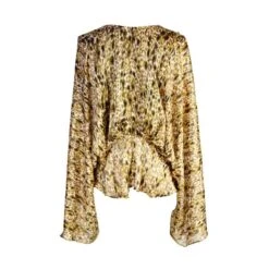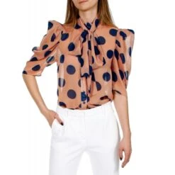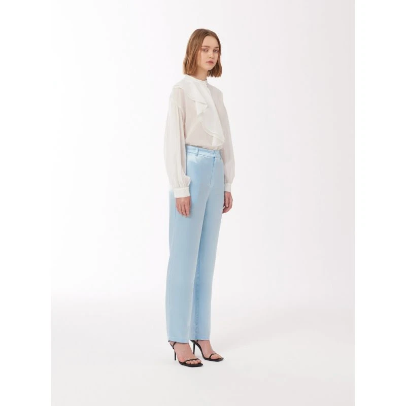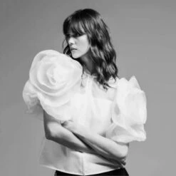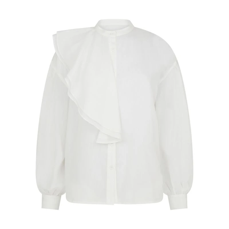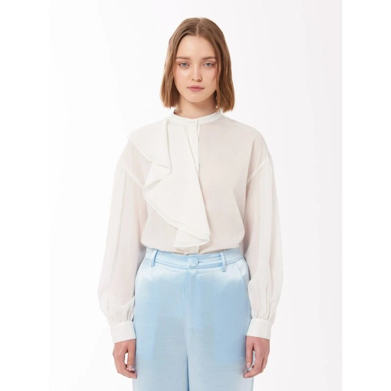 This ivory white asymmetrical ruffle shirt has an equally chic and elegant feel. It’s a statement piece with a one-sided ruffled overlay that gracefully falls from the shoulder.