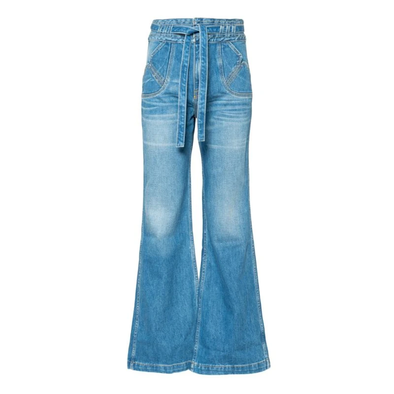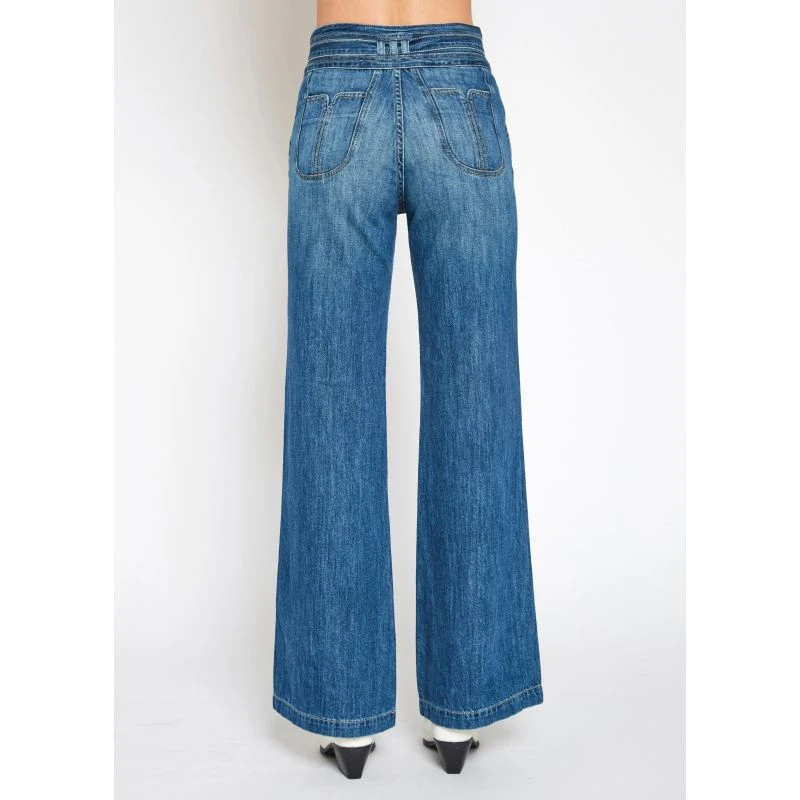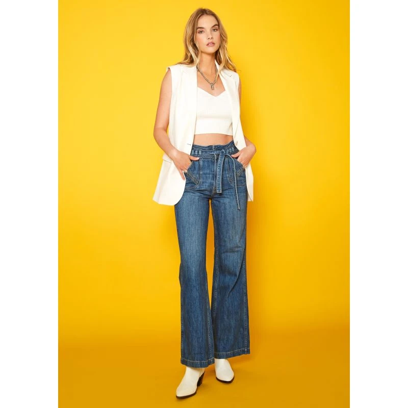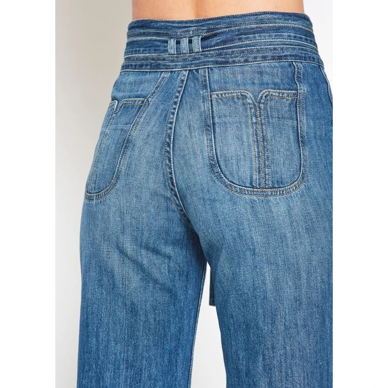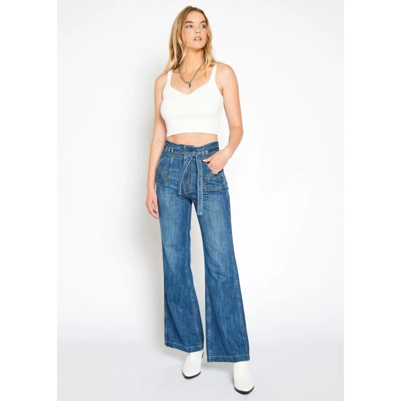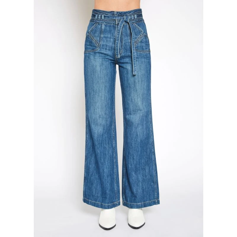 Belted high rise wide leg with fashion pocket and waistband. It is made from classic rigid denim in our bestselling classic blue wash with light fading and whiskering elements.