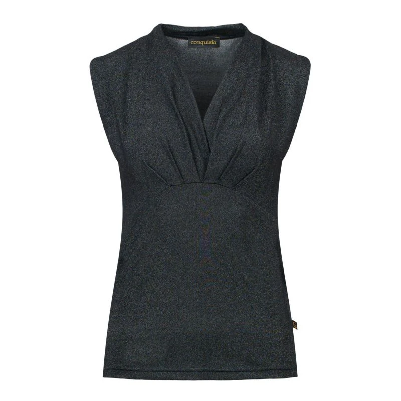 This black top is crafted in stretch fabric: viscose-elastane. It is sleeveless with a faux wrap style front creating a deep V neckline. There is a seam beneath the bust. The length for size 36/S is 32cm.