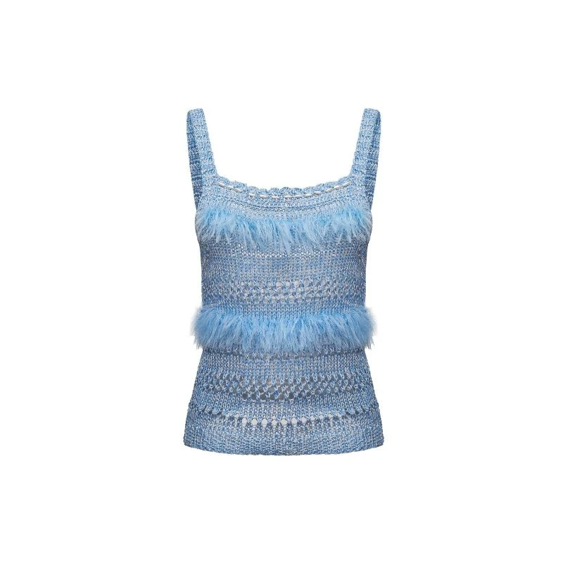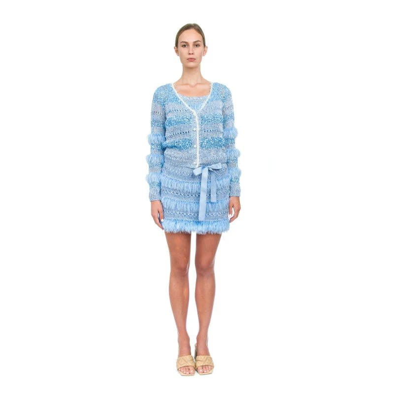 Blue Handmade Knit Top is always on trend. The top has wavy ruffles and look very feminine and stylish. You can wear it for a day and night time and it always looks amazing. Perfect combination with Blue Handmade Sweater and Blue Handmade Knit Skirt.