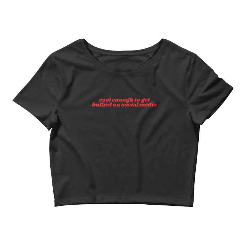 Are you sick of internet trolls ruining your day? Say f*ck them and wear this on your next IG post or TikTok. This short sleeves crop top with a design in front center will be one of your favorites. Embellished with red Bullied on Social Media lettering, wear this black cropped slim fit tee with with leggings, skirts or leather pants. A fun statement t-shirt to add to your wardrobe, you’ll be wearing this favorite on a fun night or day out.