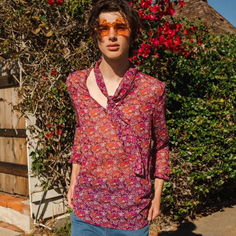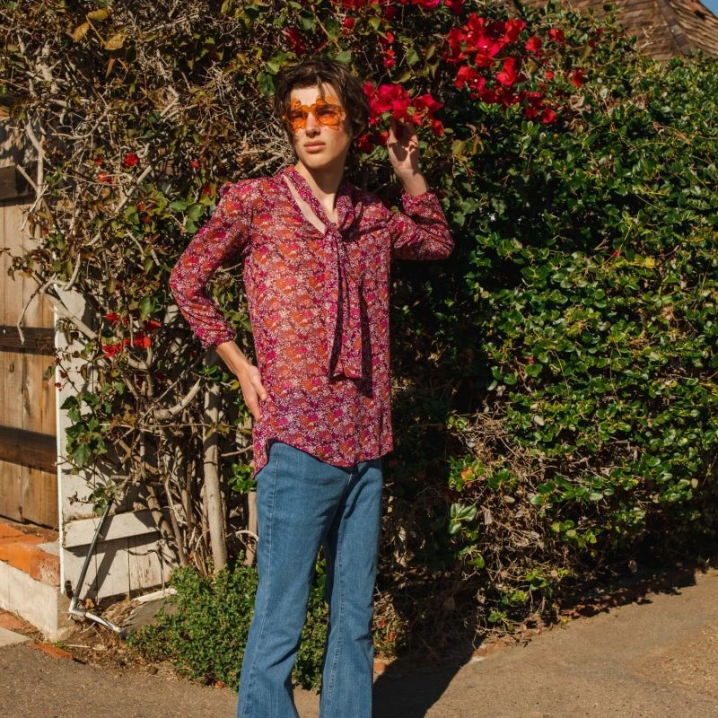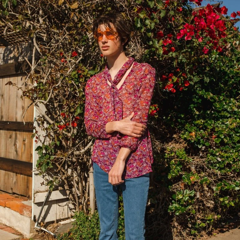 This limited edition glam rock inspired blouse is perfect from desk to dinner. Featuring a versatile bow front and sheer crimson floral fabric.