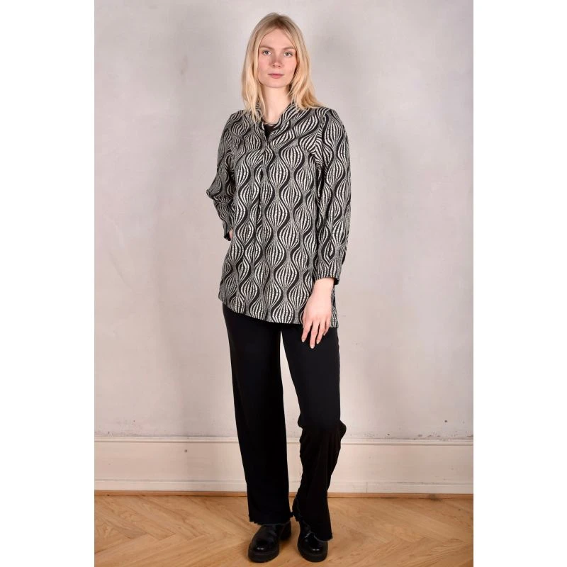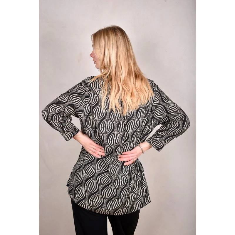 The tunic has a soft, rounded collar V-neck, side pockets and long sleeves. A deep pleat front and back give comfortable space in this style. A “belt” measuring 15X140 cm is included. This can be tied in the waist but also used as a small scarf, hair-band or?