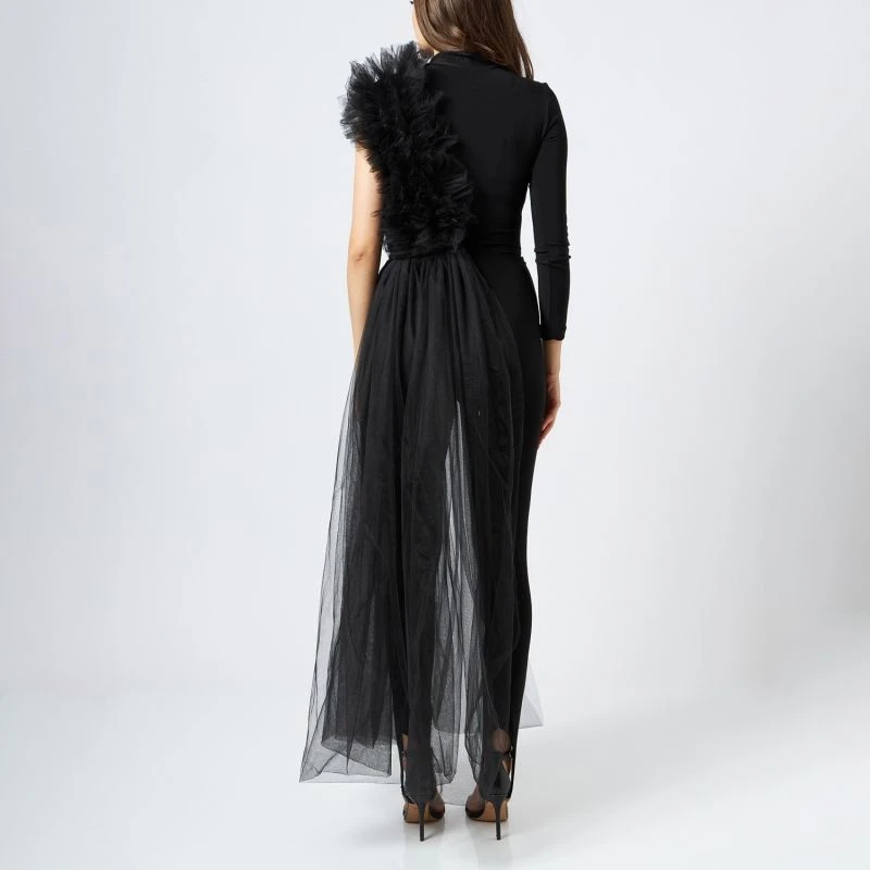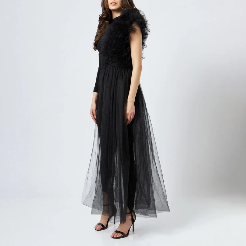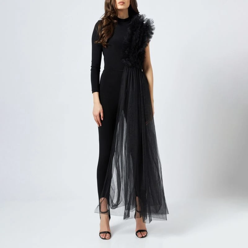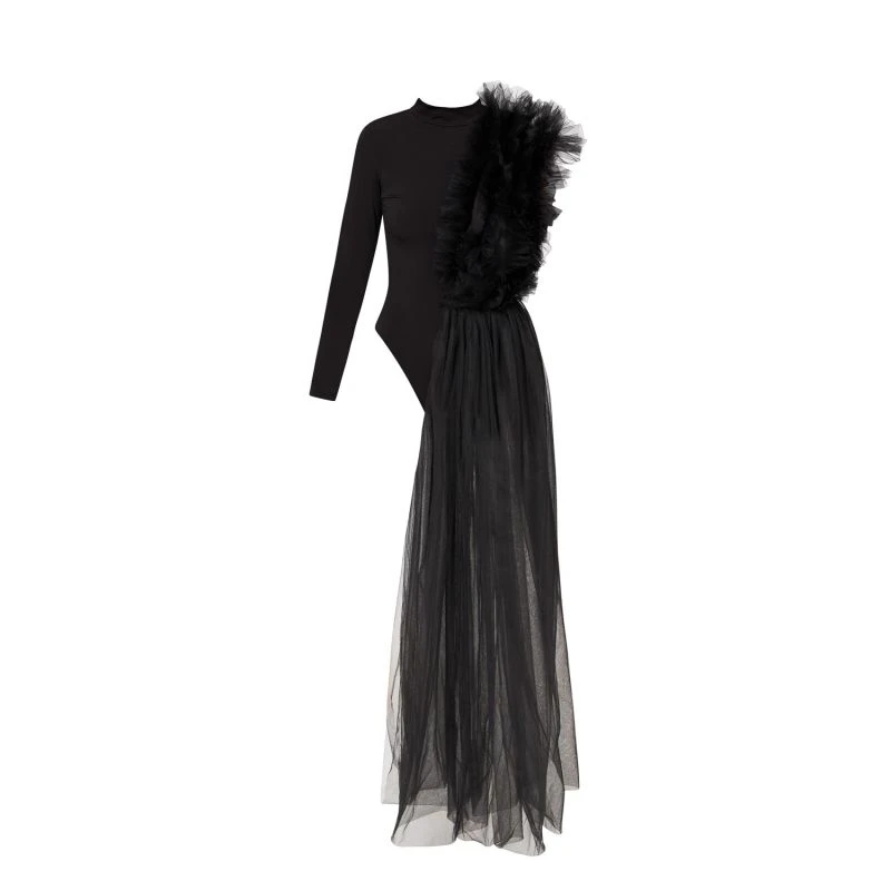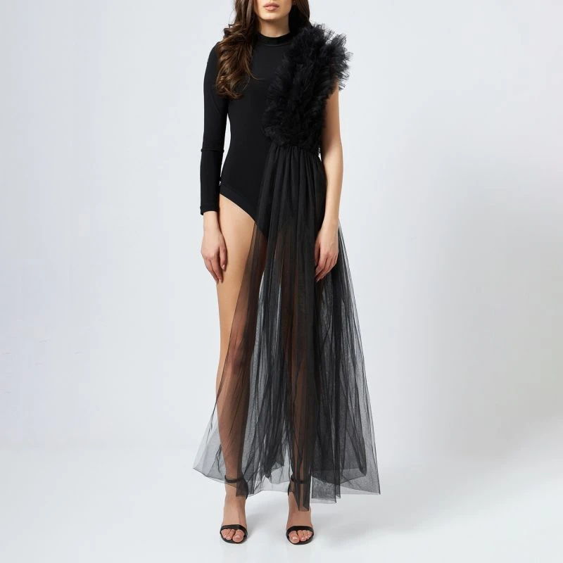 This stylish maillot features an alluring tulle ruffle deconstruction, adding a touch of avant-garde to your wardrobe. The exquisite design, reminiscent of a contemporary ballet, gracefully contours the body, accentuating your natural curves. With its seamless blend of sophistication and edge, this statement piece exudes the essence of Vogue, leaving a lasting impression at any occasion. Elevate your style to new heights with this must-have fashion-forward ensemble.