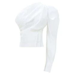 It is extraordinarily designed with a puff shoulder, bishop sleeve and draping along the bust that contrasts the fitted bodice.