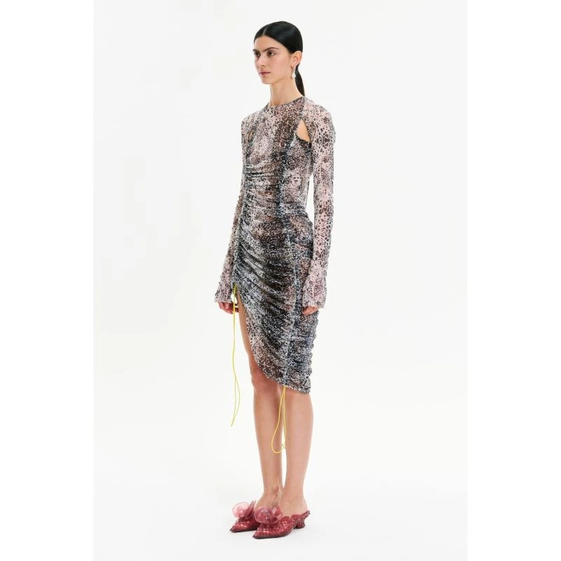 Manipulative Dress made out of semi-transparent mesh in animalistic fabric. The dress has a long raglan sleeve with an open underarms and a deeply open back. There are drawstrings to adjust the length of the dress – two in front and one in the back, as well as one button closure on the back for comfortable dressing. Perfect for going out, parties, travel, and as a comfortable daily wear. Unusual cut creates a memorable look and improves the proportions of the figure. Feel free to combine it with heels, flats and chunky boots. Cocktail evening party dress