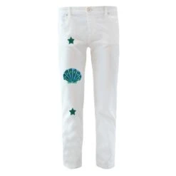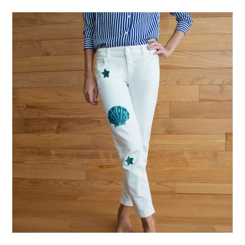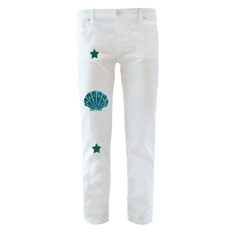 Boyfriend cropped fit jeans. 5-pocket design. Comfy, cool and relaxed loose look. Rich embroideries on special Italian white denim. Two stars and a central seashell embroidered with emerald colours on right leg. MPJ embroidered logo on back pocket and light gold buttons. Wear it going on a day-trip on boat with friends.