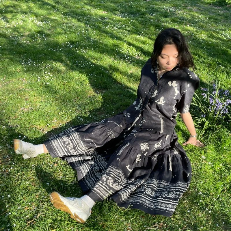 Here in Ancient Hearts black print, illustrations inspired by Ancient Egypt and imagery we found and drew from at the British Museum in London, mythical characters, sphinx, palms, vases and celestial maps. We wanted the print to feel like simple graphic ‘stamps’, we also created a meandering border which runs at the hem).