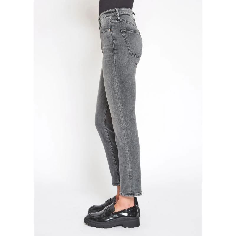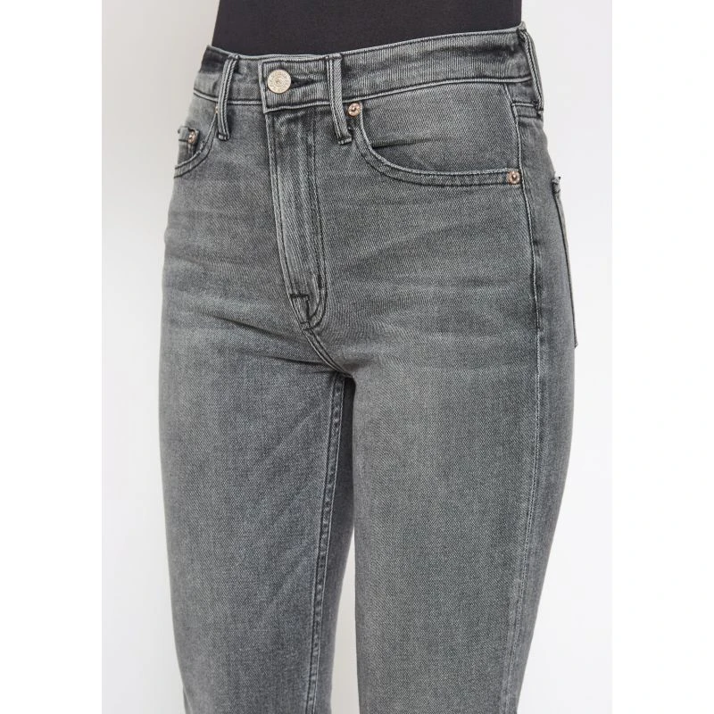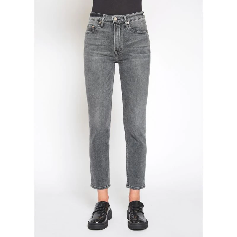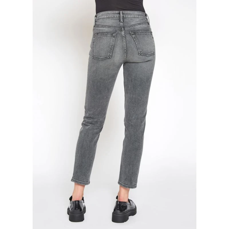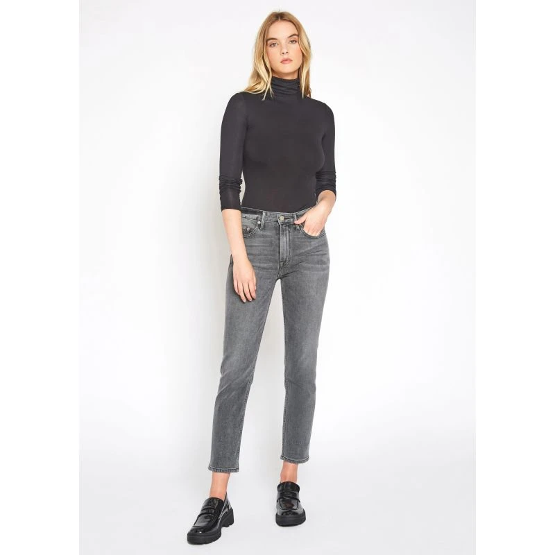 High rise slim straight in smoke grey with zipper fly & tailor hem. A touch of bleach splatter on the legs gives these high-waist nonstretch jeans an iconic look, while the straight-leg silhouette has a slim fit that flatters.