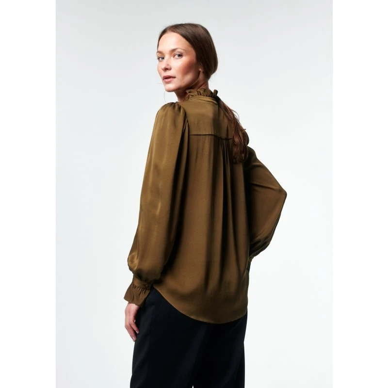 Faye silk blouse in Olive green is cut from a double silk georgette with a slight amount of stretch. The open neckline is embellished with fabric covered buttons and a high ruffle neck stand. The voluminous sleeves are completed with one buttoned cuff with ruffle. A timeless and feminine silk blouse.