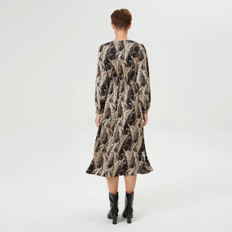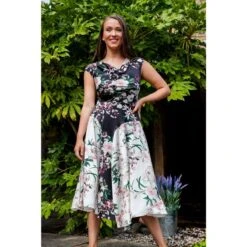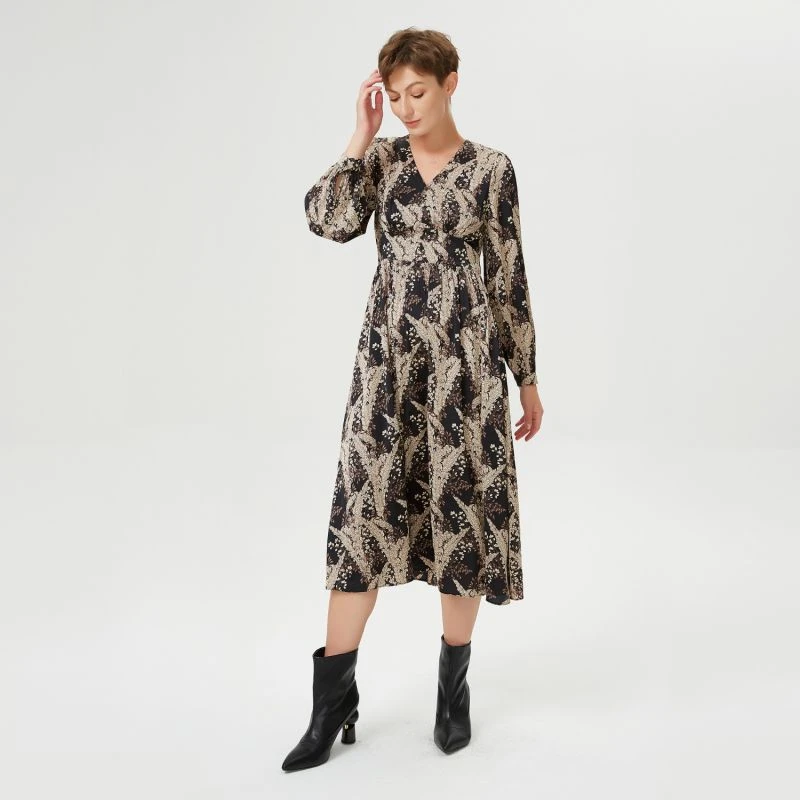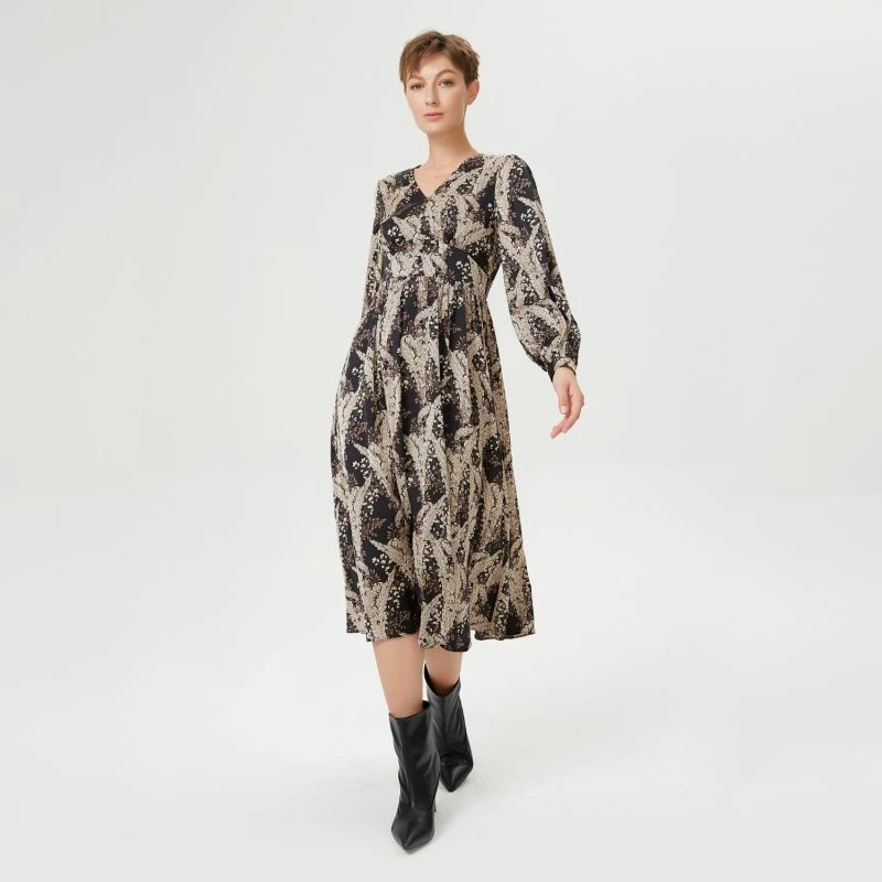 Adorned with a floral print with a vintage look, this dress offers a very flattering cut, fitted on the waist with a wide yoke and then flared. Shirt sleeves, V-neckline, an elegant and feminine silhouette and a refinement for your wardrobe. A versatile piece, to wear during the day and in the evening.