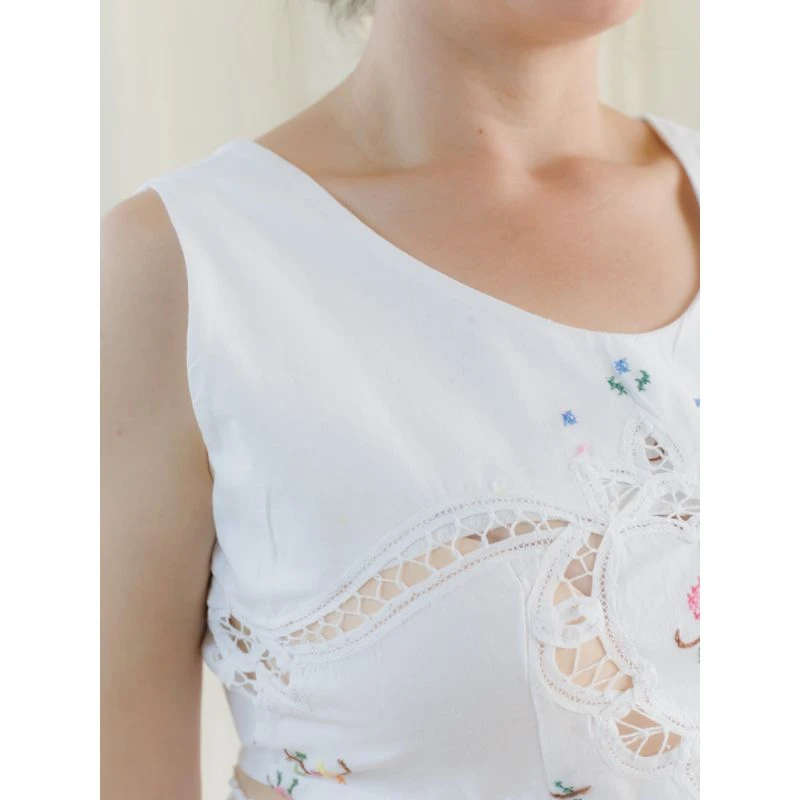 The high rise shorts are made from vintage textile and have overall elastic waist with floral embroidery and lace borders with slits. The cotton fabric in white color is soft and comfortable to wear. This sustainable and ethical outfit is hard to find and truly special. Pair it with your favorite sunhat and strappy heels for a flawless and stunning look.