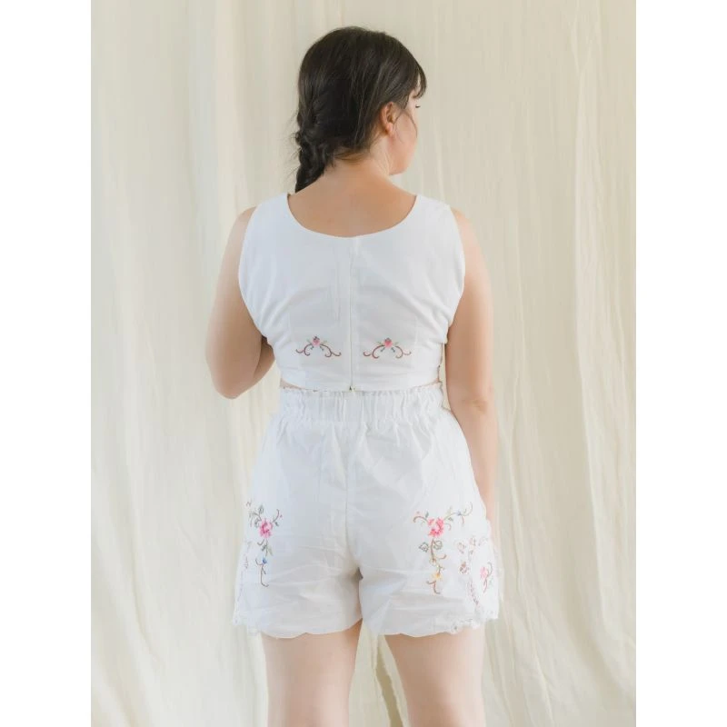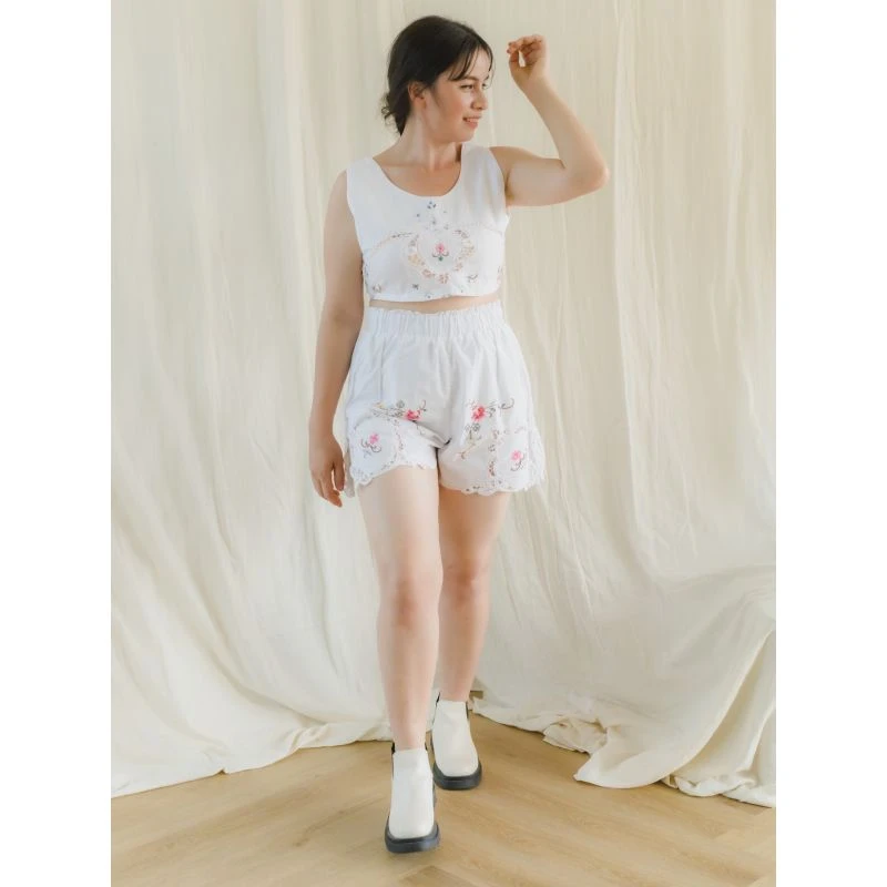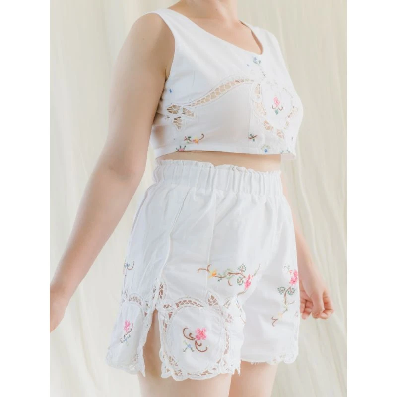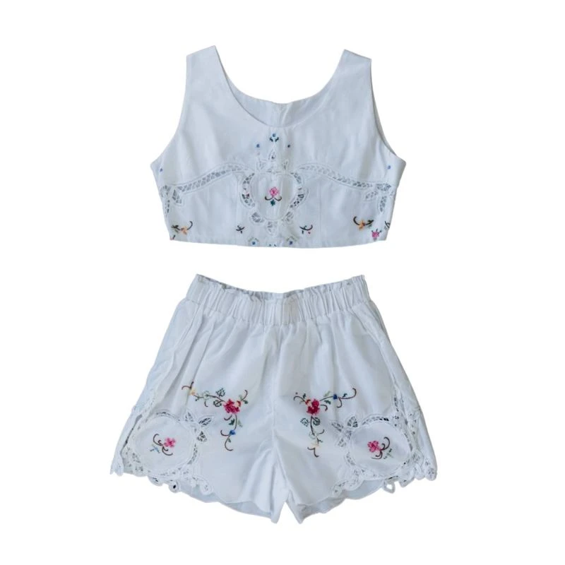 Introducing our exquisite and one-of-a-kind Crop Top and Shorts Set, perfect for summer! Hand embroidered with a subtle floral print, the minimal embroidery on the crop top adds a unique and beautiful touch to your wardrobe. The even hemline, round neck, and see-through lace detailing create an elegant and feminine look.