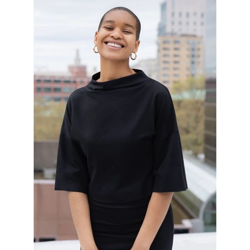 Hera is a vintage-inspired top with a wide funnel neckline and a 3/4 length wide sleeve with a dropped shoulder line. It is made with black stretch french terry which makes it elegant and super comfortable. It has a bodice that follows the shape of the body but is not made to be tightly fitted. Hera is made with natural, sustainable, and eco-friendly fabric that is a blend of Tencel and organic cotton. This fabric is super soft and very breathable making it a great fit for all seasons. This top pairs well with high-waisted skirts or pants.