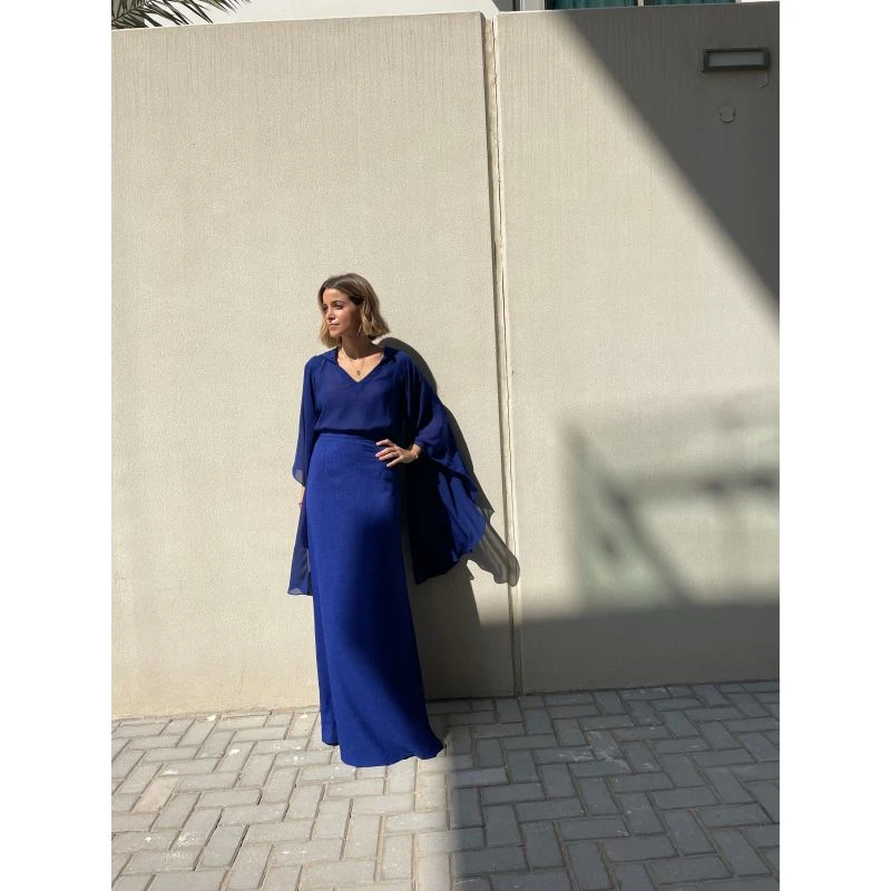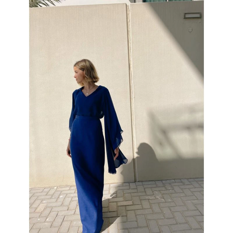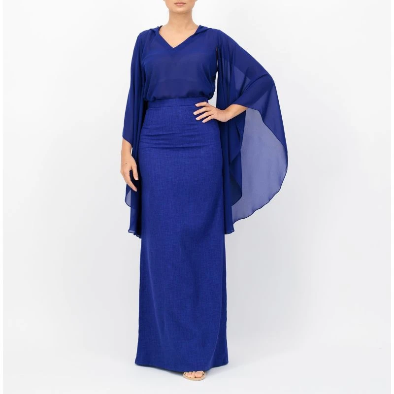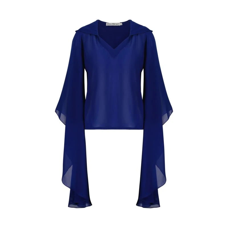 A feminine flowy chiffon top with a unique hood detail and flowy cascading sleeves. This top can be styled with jeans or dressed up with a skirt for an elegant evening look. A heavy chiffon, that is slightly see through, crafted in a beautiful shape that feels very dreamy, and the hood element stand out and adds some edge in this beautiful shade of navy blue. Top is unlined.