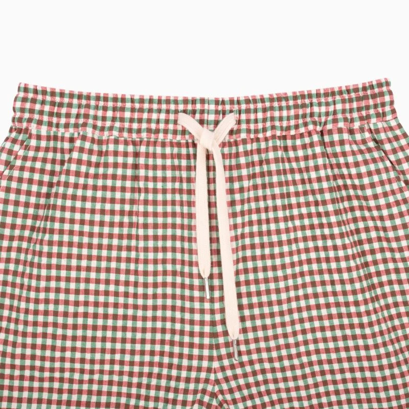 Green & red checked shorts. Straight, gender-free fit. Drawstring elasticated waistband. Double pockets with quick dry lining. Made in Bulgaria ~ 100% cotton