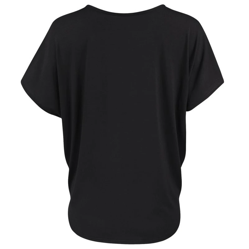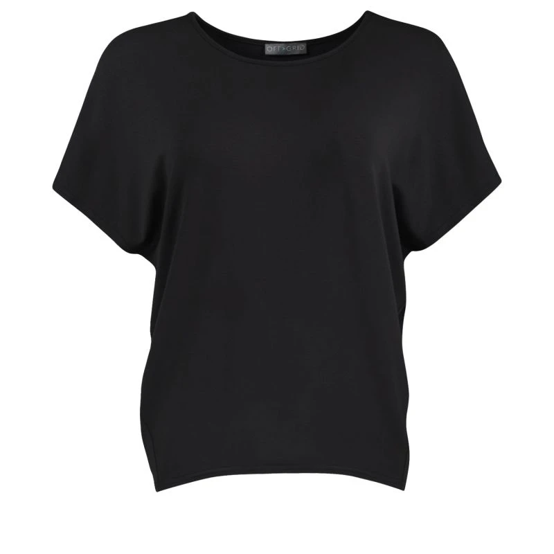 A sustainable soft bamboo jersey top in black. A real easy wear and reliable basic with a high low hem line. Bamboo absorbs five times more carbon than hardwood trees. It needs half the land cotton needs to produce the same amount of fibre and it doesn’t need irrigation or pesticides. All styles are made in the UK and are limited edition.