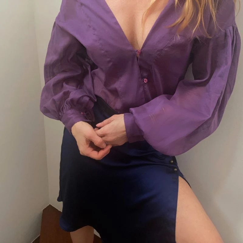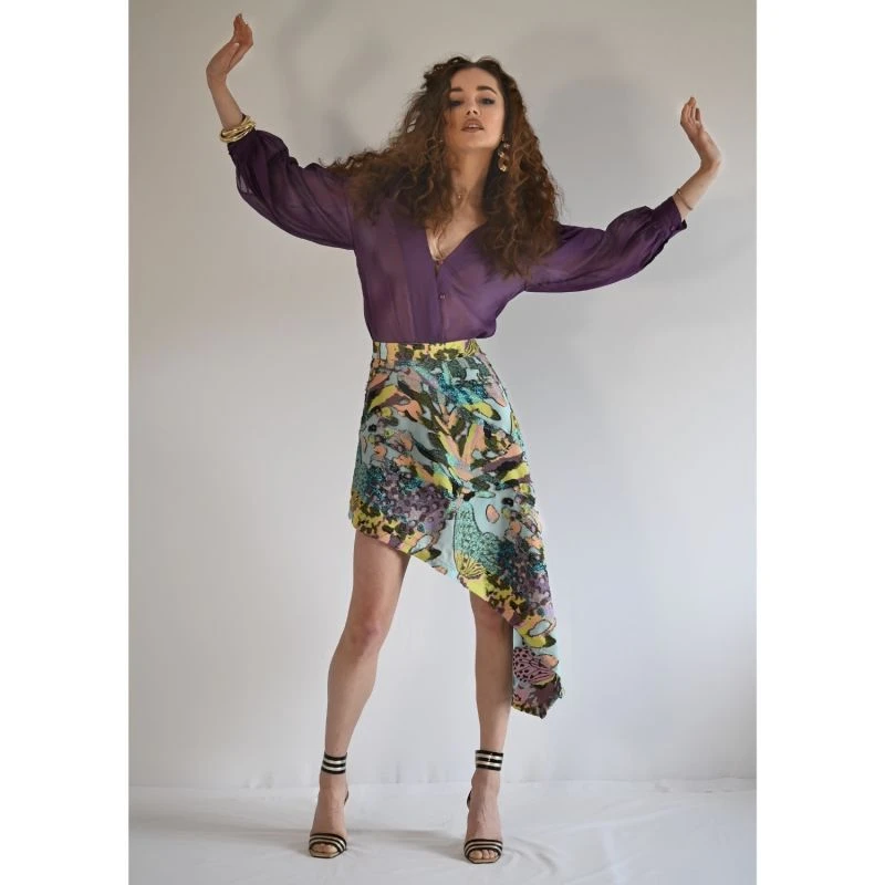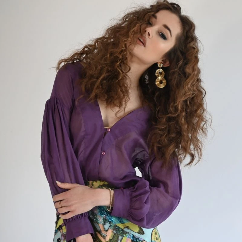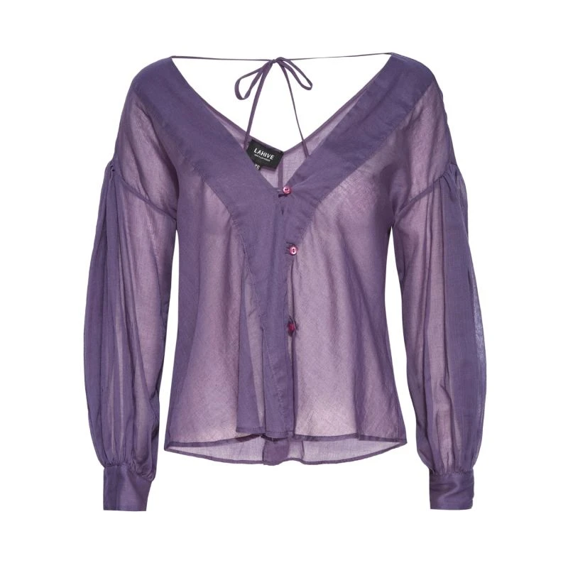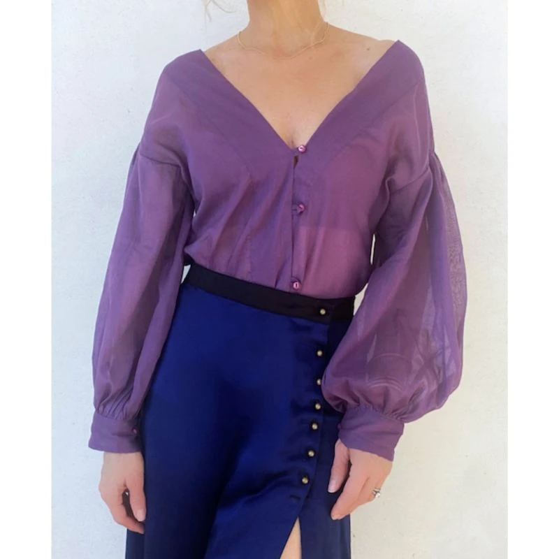 Experience the euphoria of stepping into the coastal sun with a spritz in hand when you adorn our Lake Como top. Crafted in luxurious cotton voile in an amethyst sunset hue. Its Subtle bishop sleeves are enhanced with antique-sourced buttons and a unique asymmetrical front closure. The mirrored V-neckline has an adjustable tie at the back making it the perfect option as an off-the-shoulder piece while the French seams provide an elevated finish. Get ready to dazzle with effortless style!. Pair her with our Agapi Graffiti Skirt, Bronze Ariana shorts or our Denim Lola.
