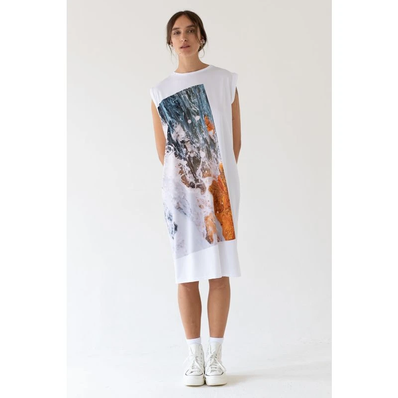 Simple sleeveless straight cut dress with original sea print. Dress is made of functional material thermocool, which is breathable, soft and comfortable on the body.