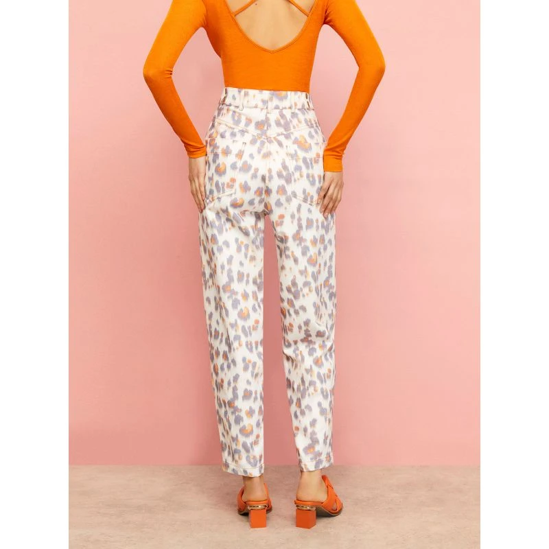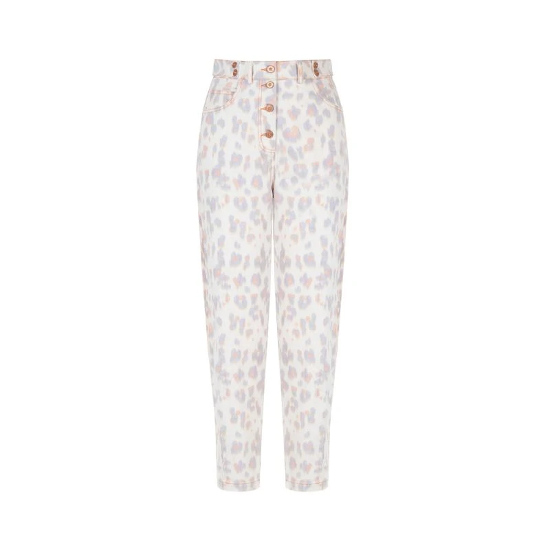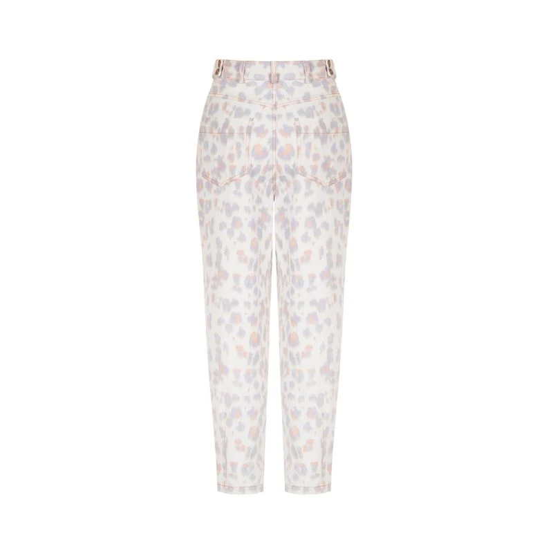 High-waisted five pocket jeans. Front metal button closure. Snap buttoned belt detail at waist.