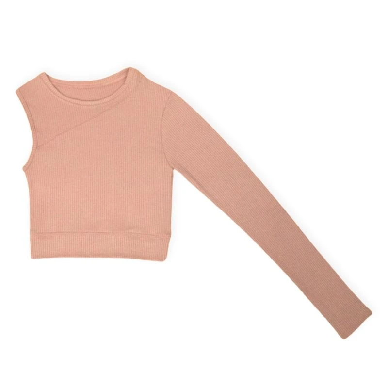 The Luve Asymmetrical Single Sleeve Crop features a limited Cotton stretch rib knit in 2 exclusive colors, Sage Green and Haze Coral.