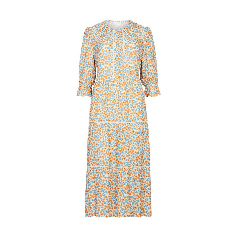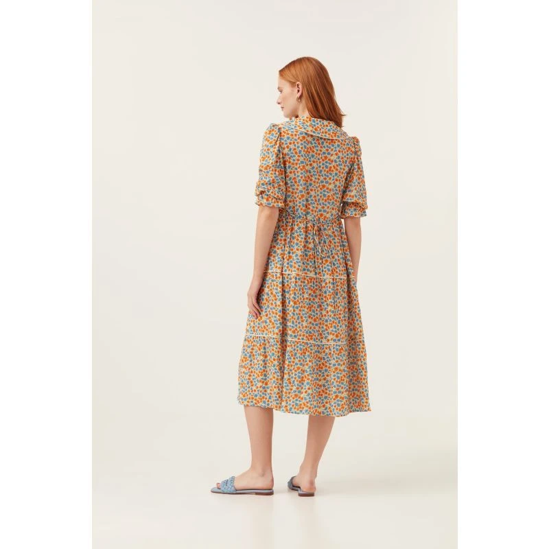 A gorgeous Bloom Floral Print tiered midi dress featuring an oversized collar and contrast piping. A super comfortable style for Spring Summer ’22 with gathered puff sleeves, elasticated cuff and mother of pearl buttons at front bodice. Fits true to size.