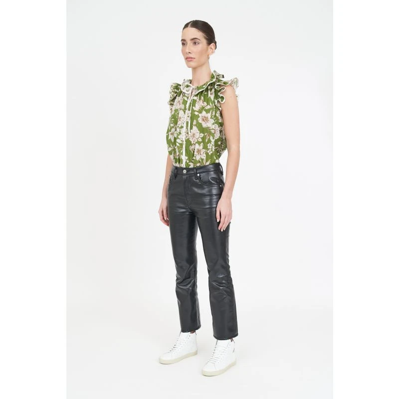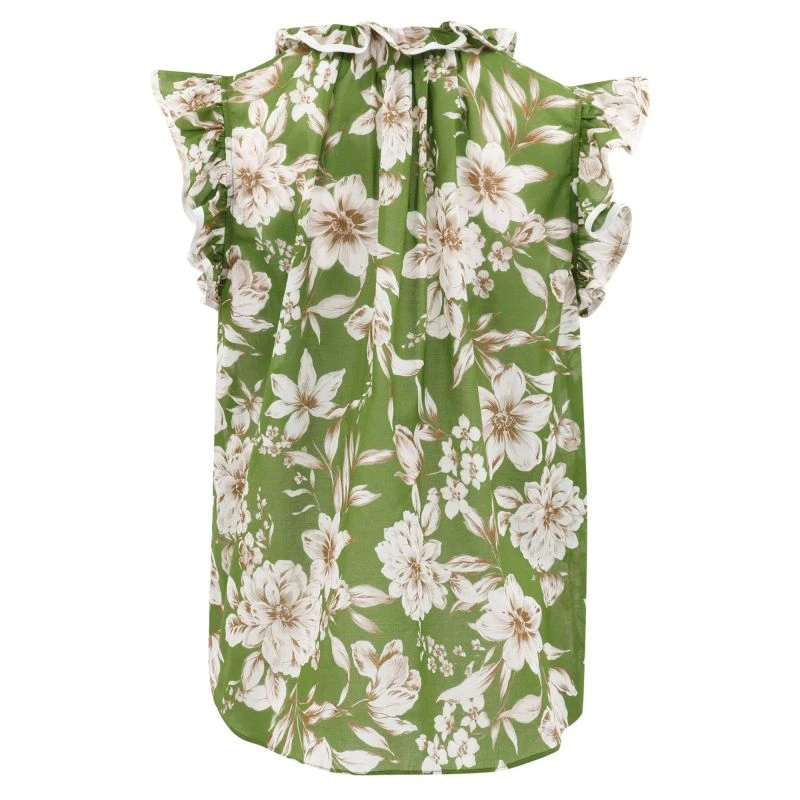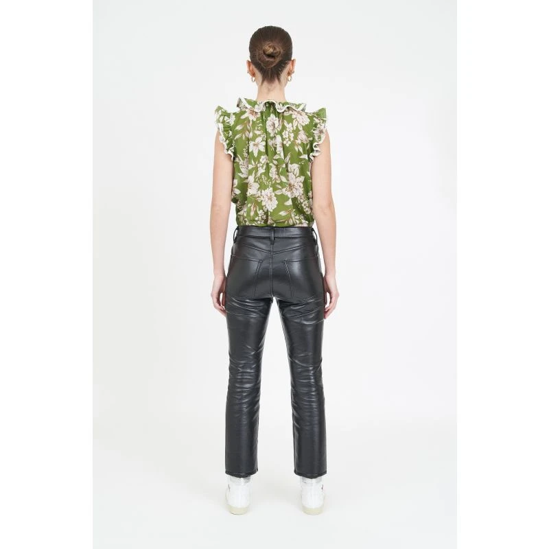 The Nadya Top is cut in our hand-painted Green Magnolia motif and breathable cotton voile fabrication. The blouse is designed with delicate ruffles at the neck and the sleeve all piped out in our Ivory Magnolia print for an extra layer of dimension. Complete with a v-neck self-tie at the top of the neck.