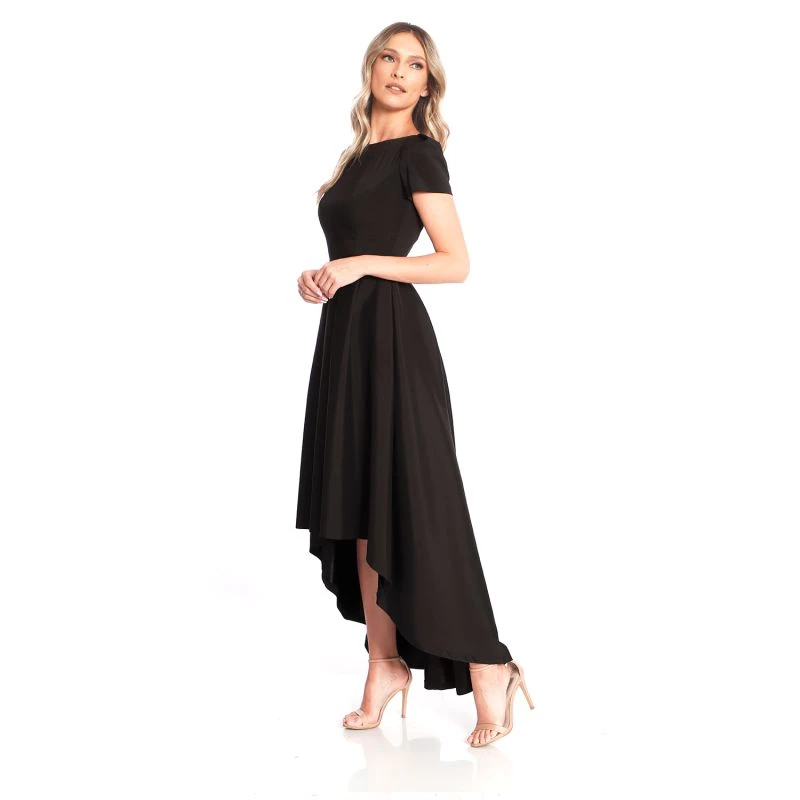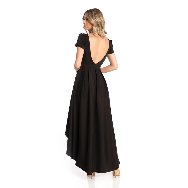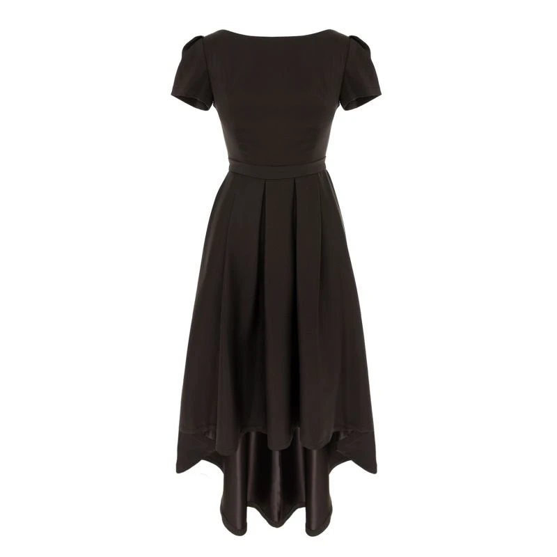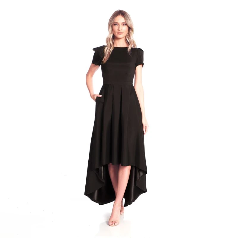 The back also contains a short cocealed zipper. There is an Asymmetrical flare at the hem.