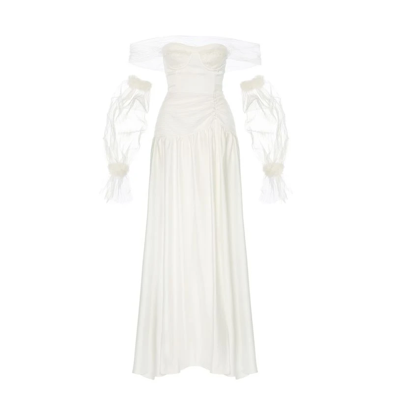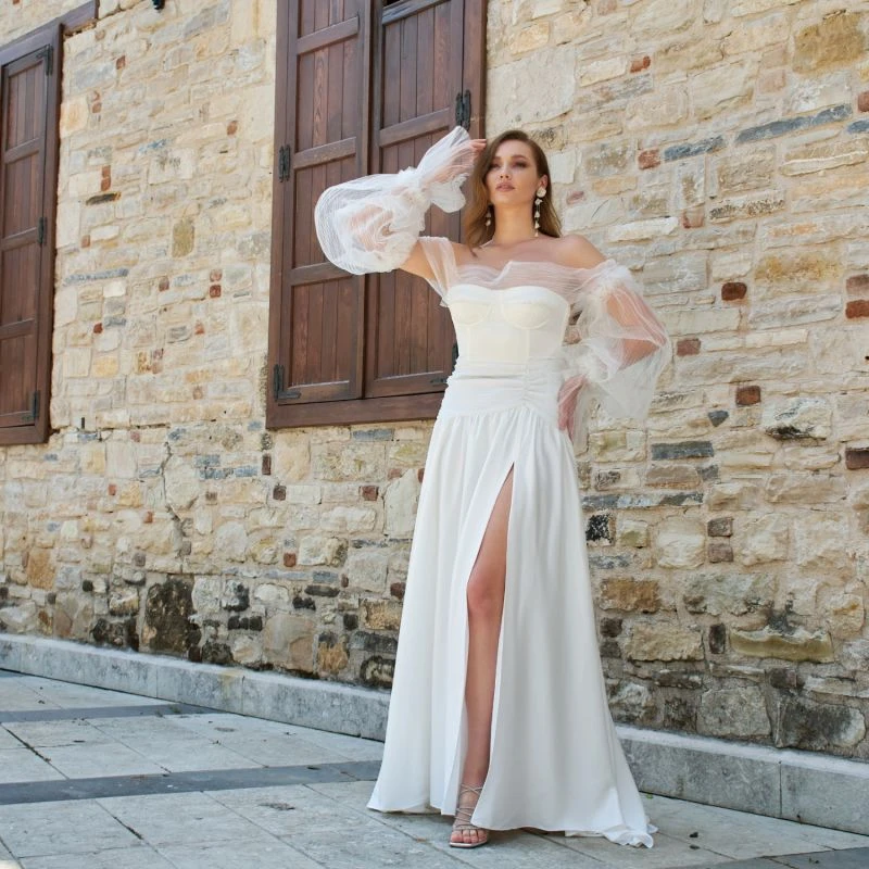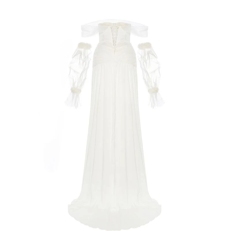 Feel like a modern princess in this soft luxe silk satin A-line bridal gown. Featuring a soft sweetheart neckline with a pleated hand decorated with beads bodice, and detachable pleated sleeves. The chic A-line skirt is enhanced with asymmetric hand-decorated draping cut detail that is met with a sexy slit. It will catch everyone’s eye when walking down the aisle. This look is finished with a corset lacing for adjustability in the fit at the backside and an invisible zipper at the skirt .