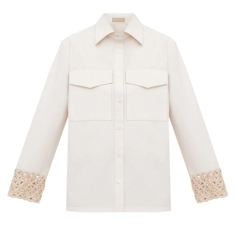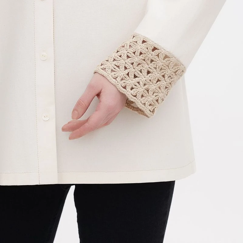 This piece has a loose fit and long sleeves with a full-button close and a traditional point collar. The cuffs are hand-knitted from ramie.