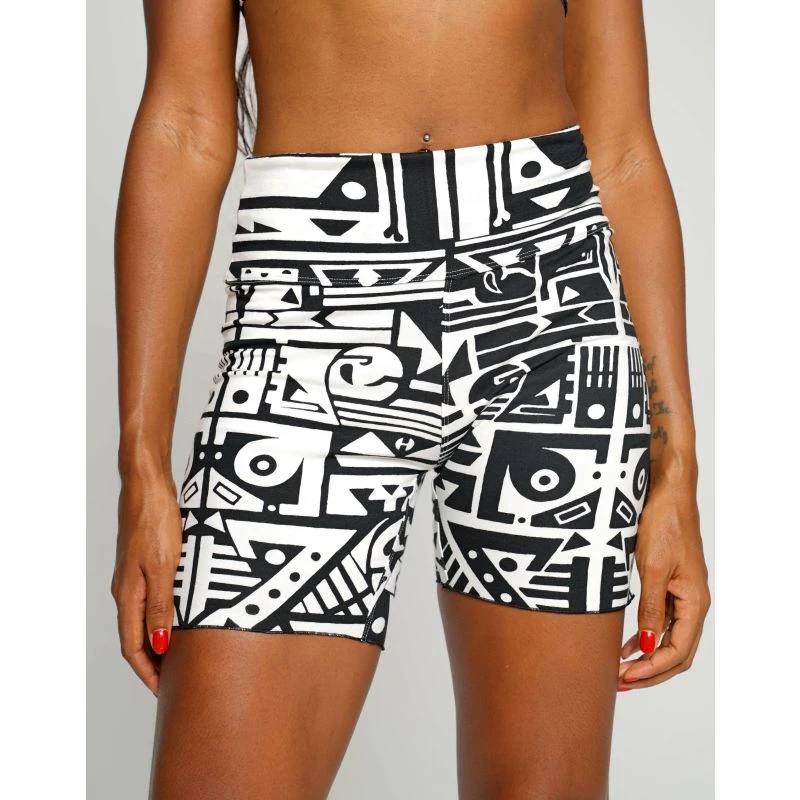 Comfy activewear sports shorts made from super-soft, ethical and sustainable bamboo fabric. Fun and bold design created from original Bam-Bam monochrome illustrative abstract designs, printed onto bamboo fabric, a fabric that is soft with a slight stretch. The fabric is an abstract visual language that changes as it moves with the body, each pair of shorts is slightly unique as if from a different part of the abstract fabric.