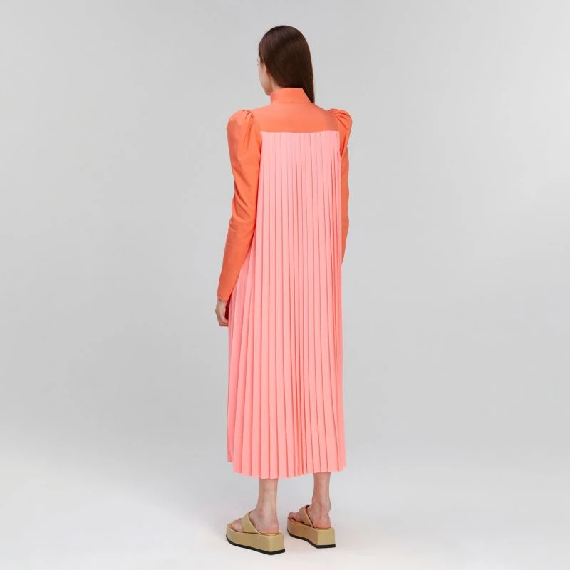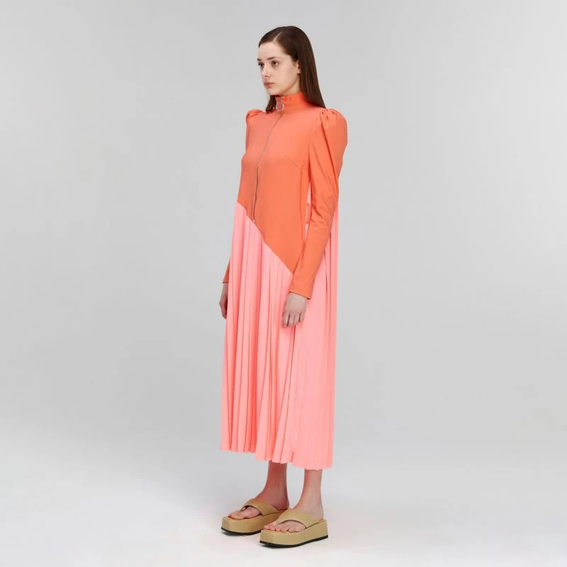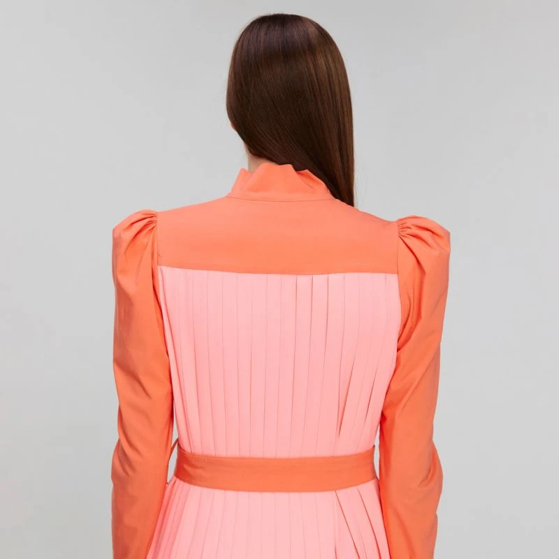 Supreme combination of sporty, draped and pleated is the key idea of the PRINCESS dress. High collar and shoulder-puff long sleeves – feel royal and stay comfy. A Detachable fabric belt is here to help with styling: emphasize the waist, make a knot on your back or just loosen it up.