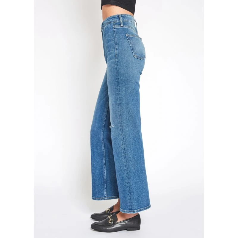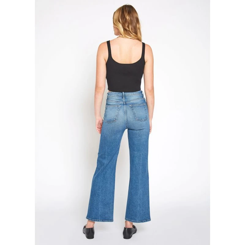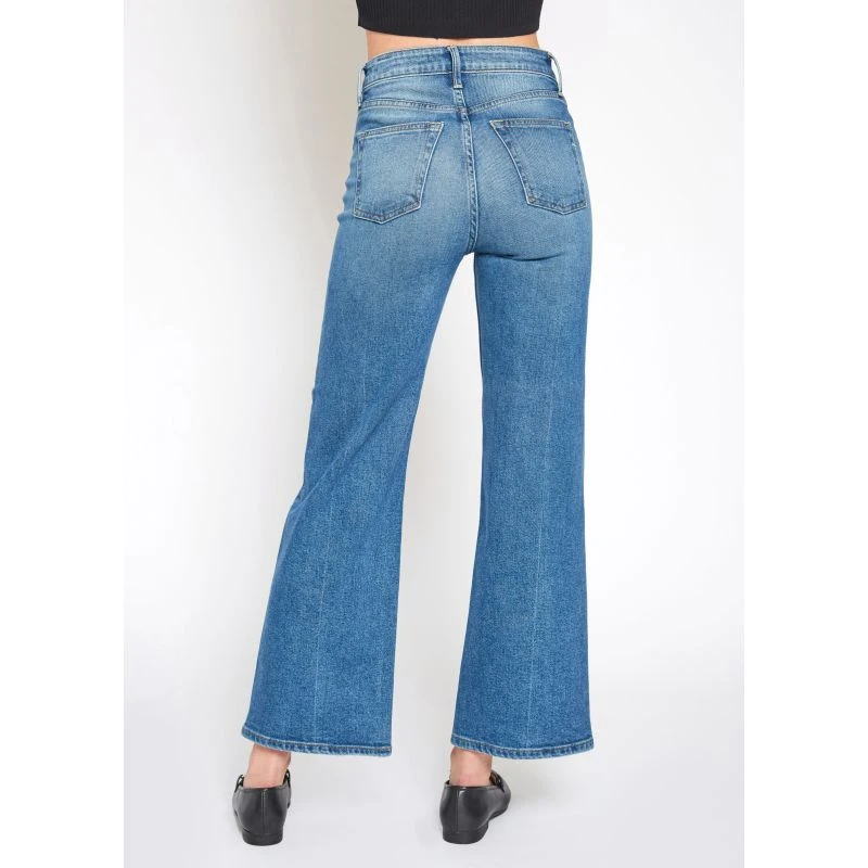 Perfected high-rise wide-leg crop. Queen is crafted from smooth stretch denim in a medium blue wash with subtle fading and whiskering.