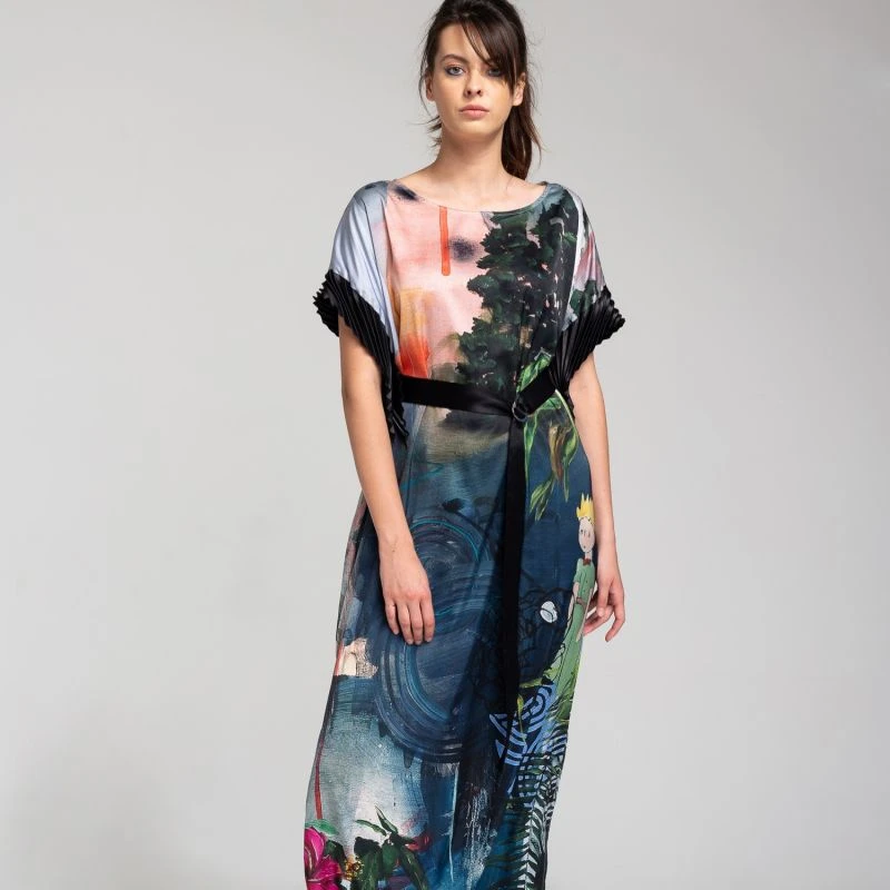 Elegant long polyester silk dress with a satin belt, printed with a unique painting of Ludovic Thiriez