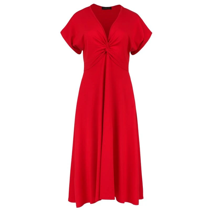This red summer dress is crafted in stretch jersey fabric. It has short sleeves and a V neckline with knot detail at the bust. Underneath, a 5cm panel finishes diagonally at the side seams. The skirt has a cloche silhouette. The garment is styled with a relaxed fit and midi length.