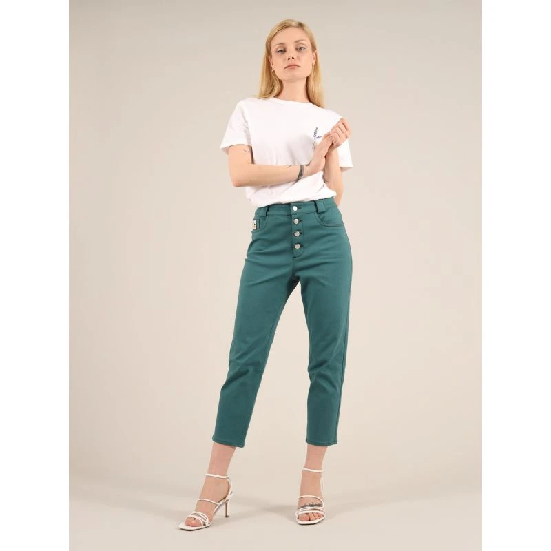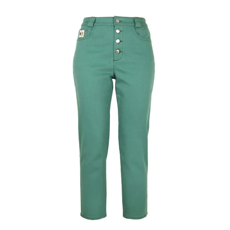 The Rogue Jeans have a high-waisted, mom’s jeans fit with cropped legs. Fastened with four metal buttons. They come in a fresh green colour and have a cheeky flash detail on the back pockets. For easy-breezy summer days.