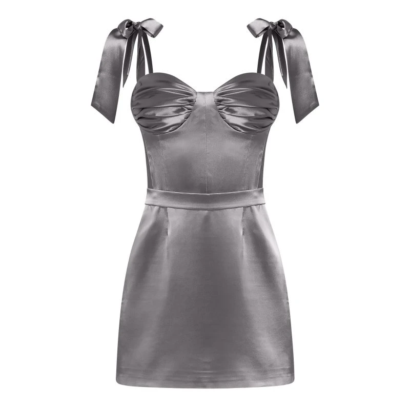 The curve-hugging waistline of the dress is highlighted by a self-tie belt and an A-line mini skirt.