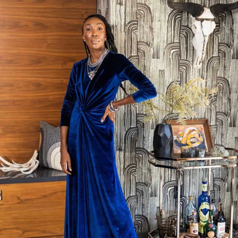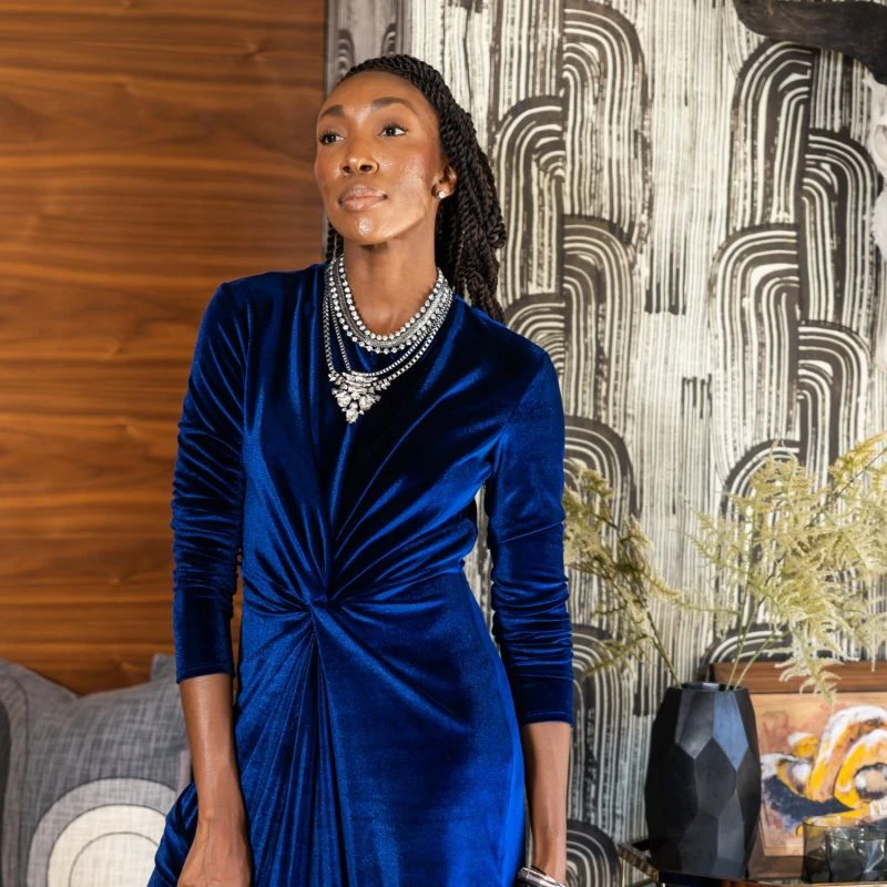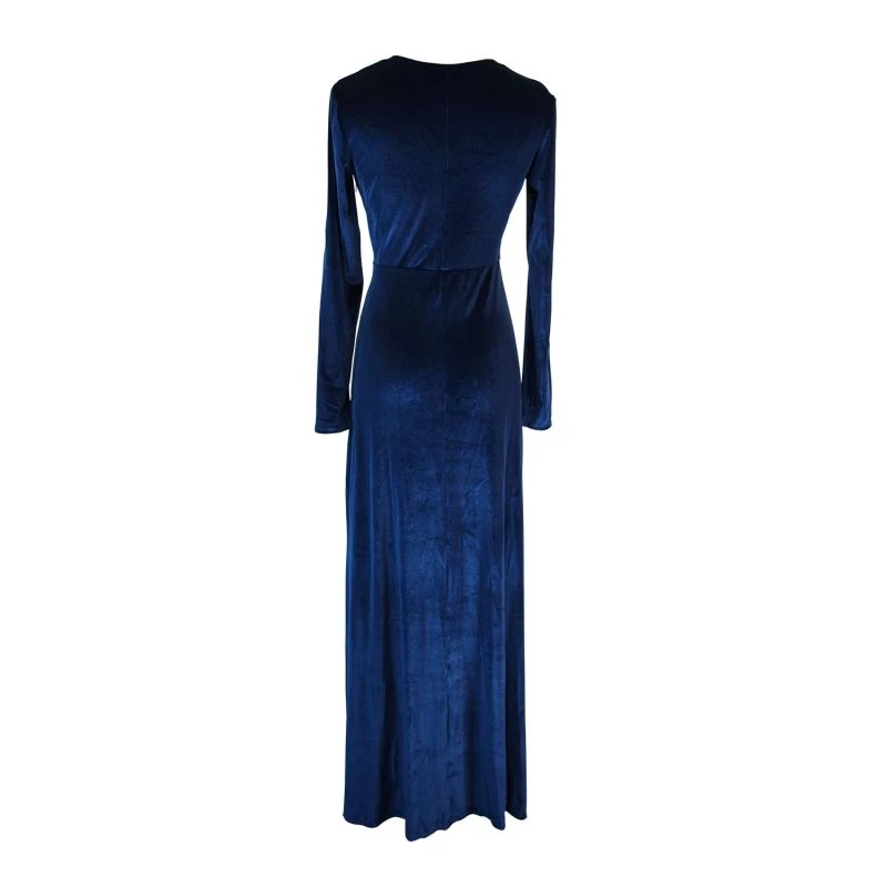 This floor-length royal blue stretch velvet dress is cozy and glam! With long sleeves, elastic and a flattering knot detail at the waist.