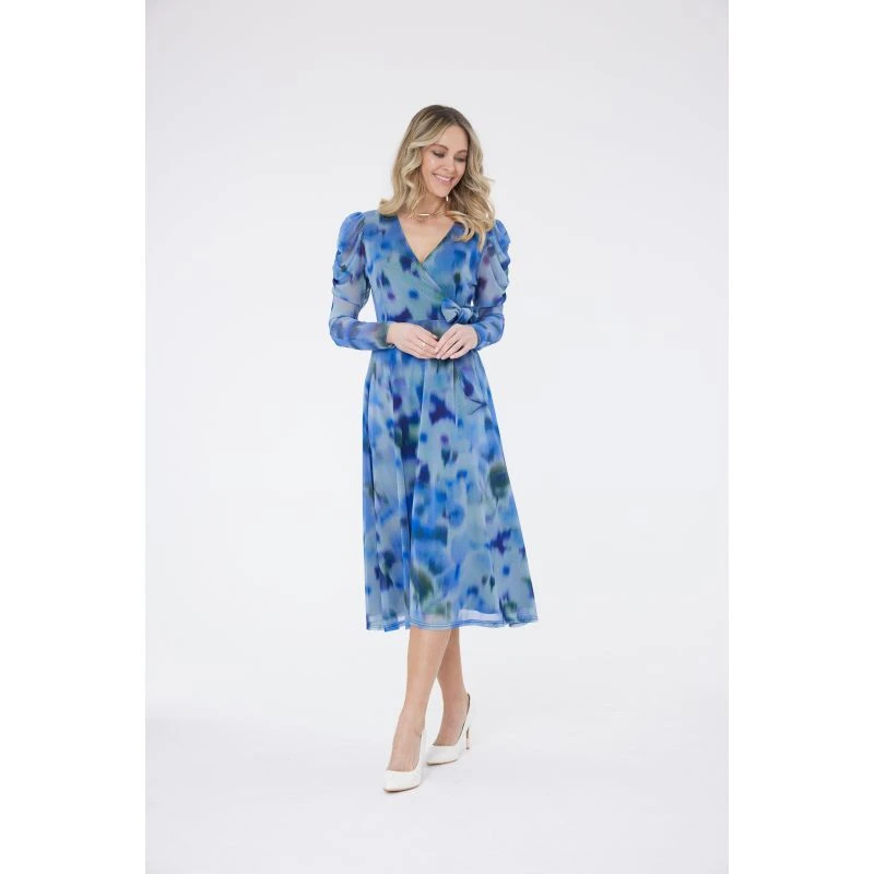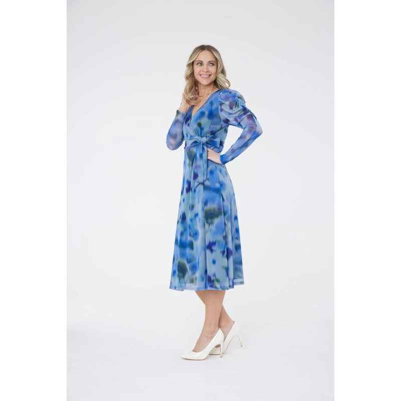 This plunge neckline, power mesh dress with lining is the perfect balance between comfort and stylish. Featuring rouched mesh sleeves, blue and black print, this dress is timeless. This statement piece cinches with a tie waistband and drapes effortlessly over your curves. The light stretchy mesh finish gives the full length sleeves a flattering transparent look. Style with your favourite heels or flats and you are ready for any occasion.