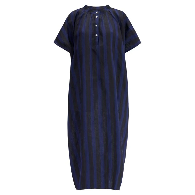 Shary Linen Short-Sleeved Long Dress With Gathered Neckline And Side Pockets In Midnight Navy Cabana Stripe Block Print