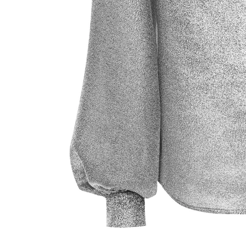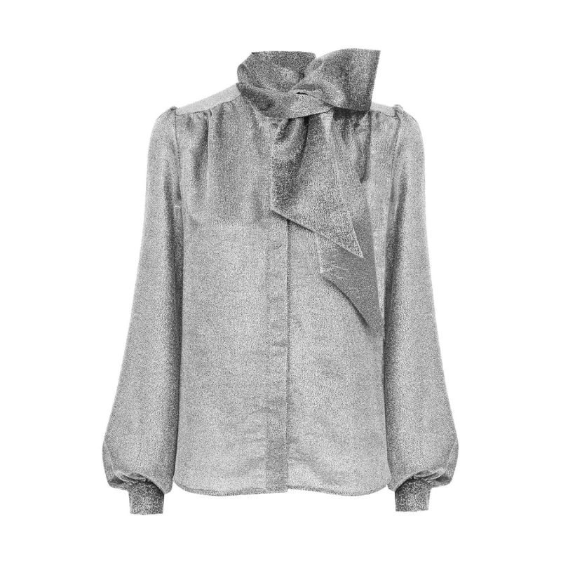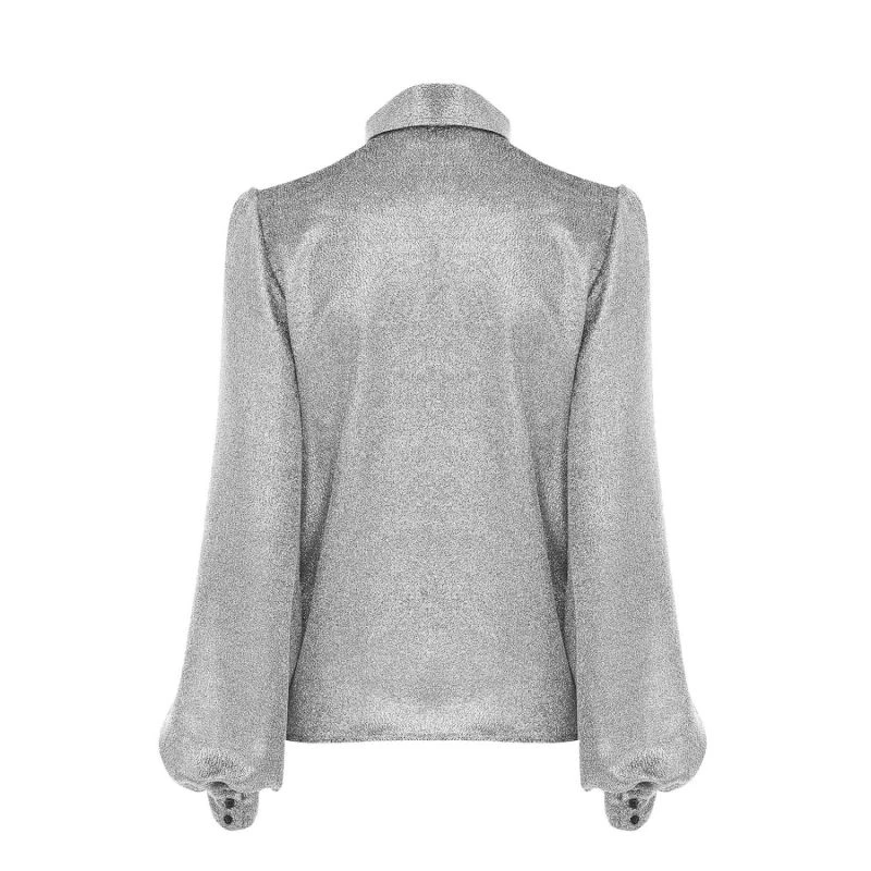 Silver blouse with a metallic sheen made of silk fabric and metallic fiber , two long sashes allow for any arrangement variants.
