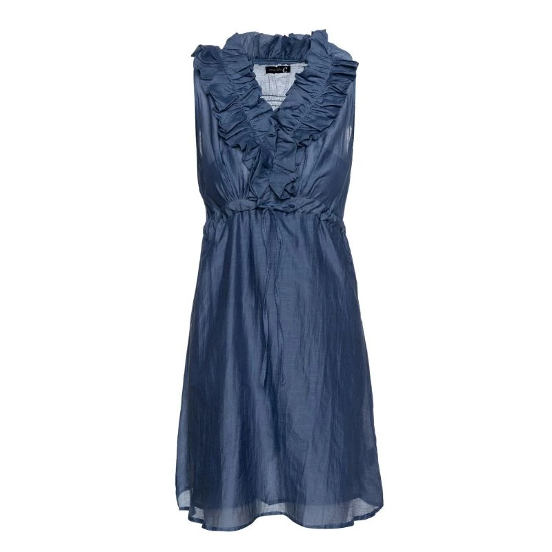 Feel the frill in this uber soft lightweight dress. The ruffled V- neck detail and the drawstring under the bodice create an ultra-feminine appeal. This fully lined little number will be your go-to piece during those warmer months. Sleeveless.