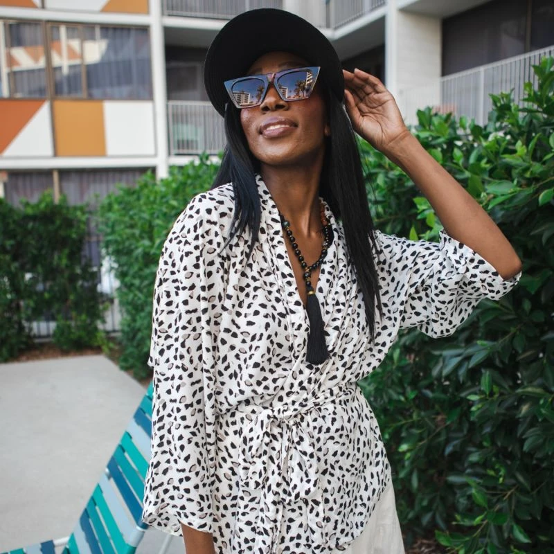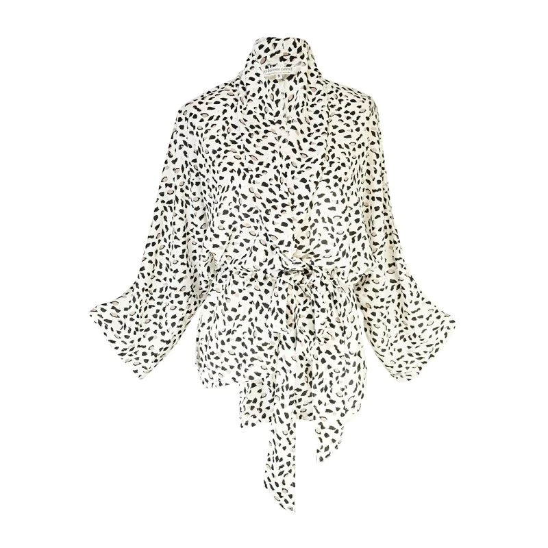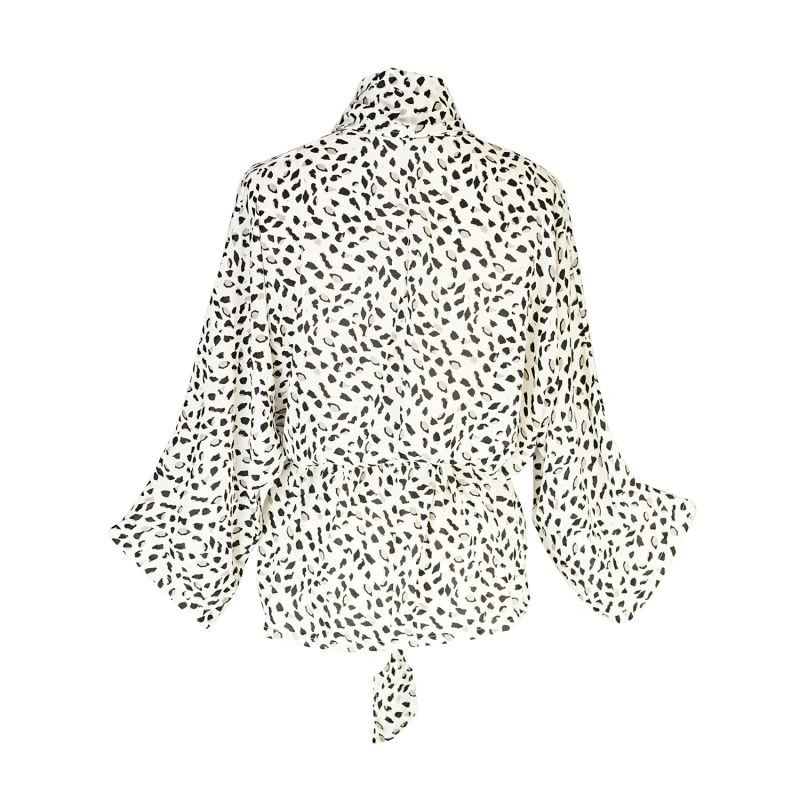 This lovely dolman wrap kimono is perfect for styling high or low. Made with a machine washable opaque ivory leopard print georgette and lots of love! Featuring an inset, adjustable belt at back waist as well as a versatile shawl collar.