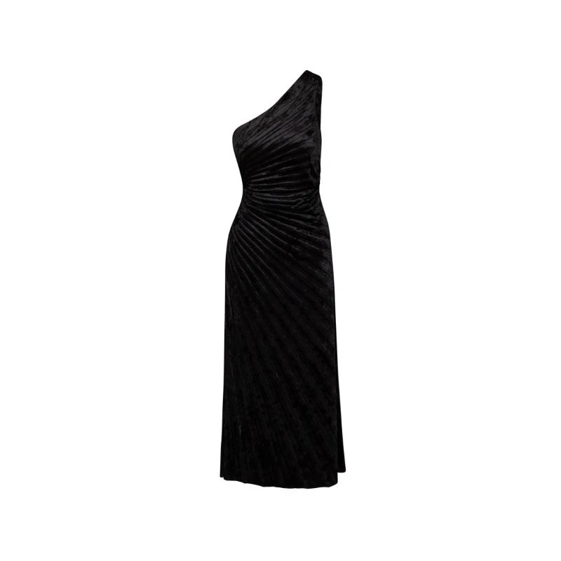 This stunning one shoulder long dress in black features diagonal pleating and a side adjustable cutout for a touch of playfulness. This dress is a versatile statement piece.